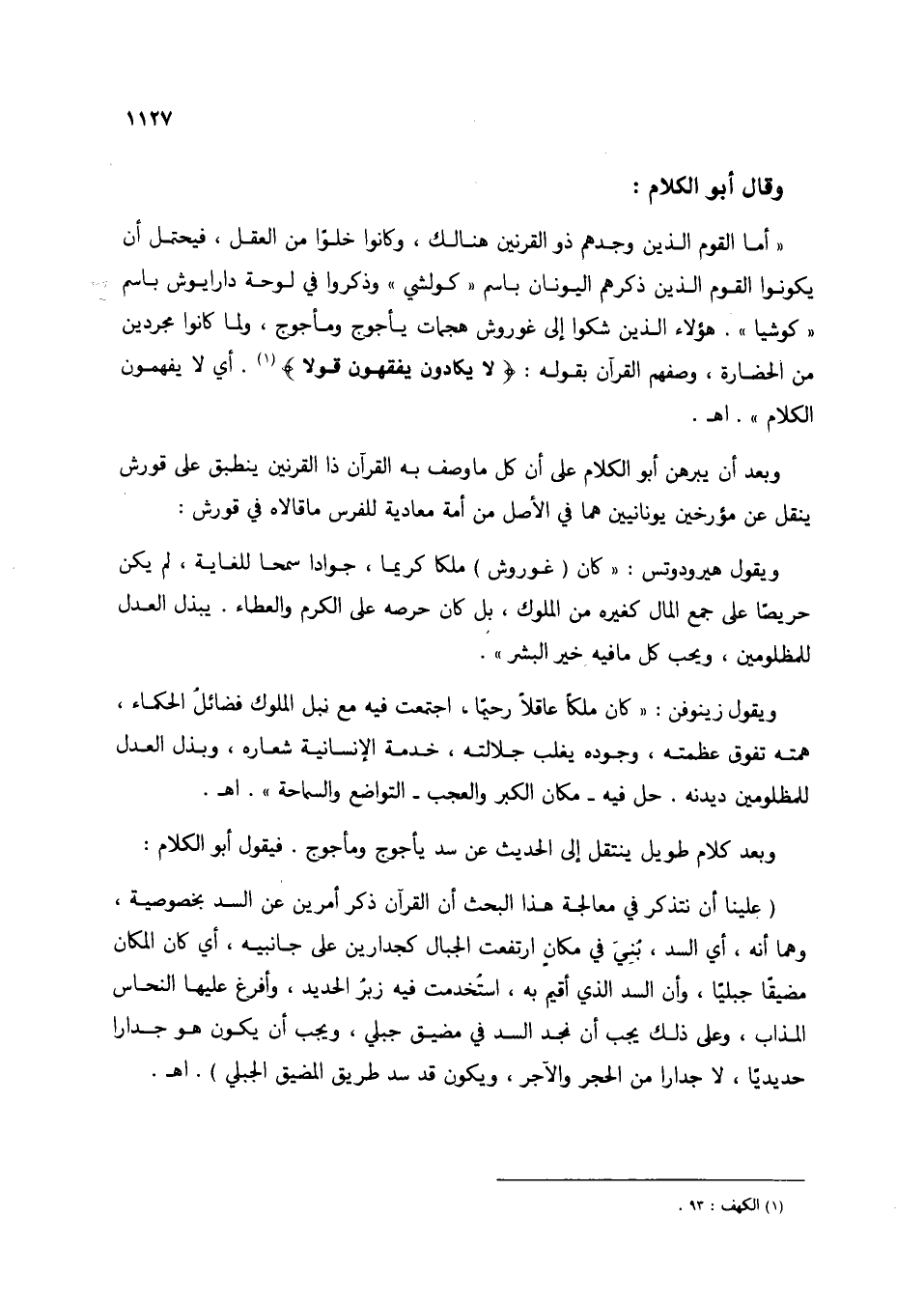وبعد كلام طويل ينتقل إلى الحديث عن سد يأجوج ومأجوج. فيقول أبو الكلام: