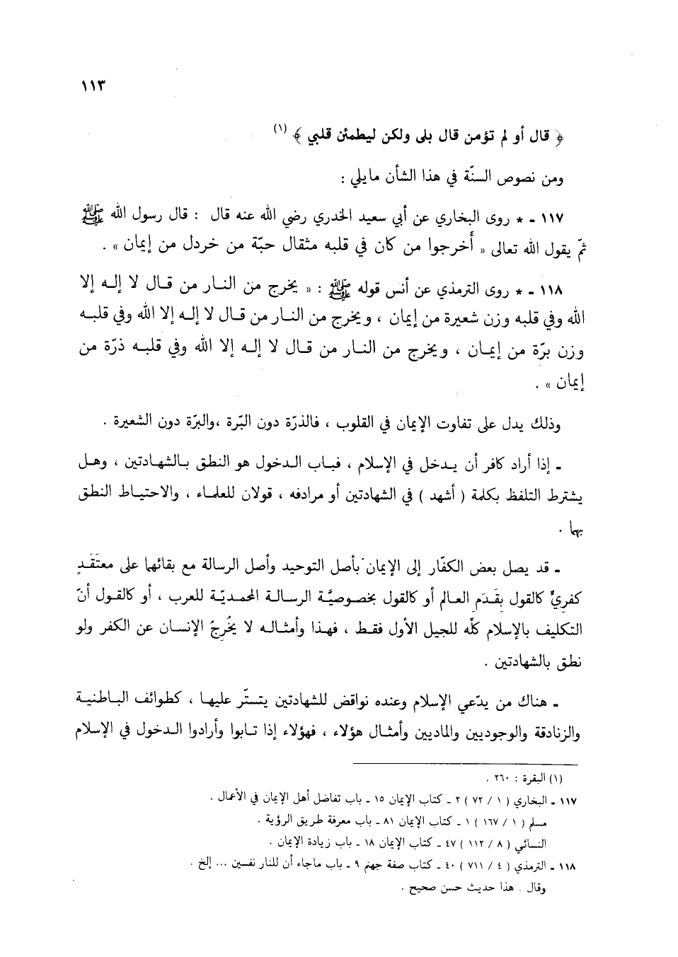 118 - * روى الترمذي عن أنس قوله صلى الله عليه وسلم: "يخرج من النار من قال لا إله إلا الله وفي قلبه وزن شعيرة من إيمان، ويخرج من النار من قال لا إله إلا الله وفي قلبه وزن برة من إيمان، ويخرج من النار من قال لا إله إلا الله وفي قلبه ذرة من إيمان".