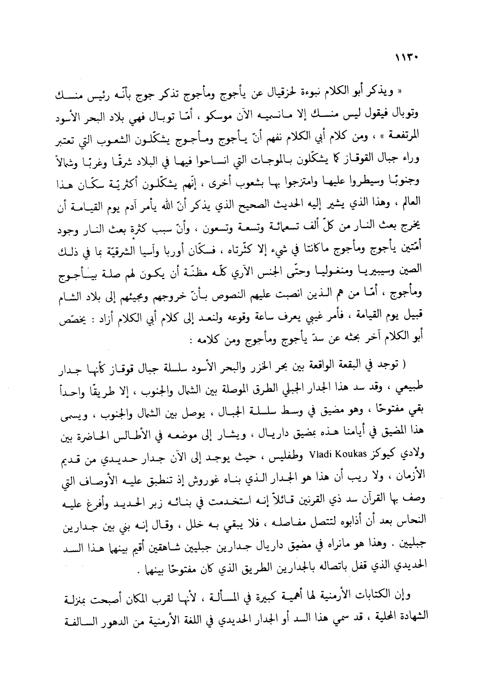 (توجد في البقعة الواقعة بين بحر الخزر والبحر الأسود سلسلة جبال قوقاز كأنها جدار طبيعي، وقد سد هذا الجدار الجبلي الطرق الموصلة بين الشمال والجنوب، إلا طريقًا واحدًا بقي مفتوحًا، وهو مضيق في وسط سلسلة الجبال، يوصل بين الشمال والجنوب، ويسمى هذا المضيق في أيامنا هذه بمضيق داريال، ويشار إلى موضعه في الأطالس الحاضرة بين ولادي كيوكز Vladi Koukas وطفليس، حيث يوجد إلى الآن جدار حديدي من قديم الأزمان، ولا ريب أن هذا هو الجدار الذي بناه غوروش إذ تنطبق عليه الأوصاف التي وصف بها القرآن سد ذي القرنين قائلًا إنه استخدمت في بنائه زبر الحديد وأفرغ عليه النحاس بعد أن أذابوه لتتصل مفاصله، فلا يبقي به خلل، وقال إنه بني بين جدارين جبليين. وهذا هو ما نراه في مضيق داريال جدارين جبليين شاهقين أقيم بينهما هذا السد الحديدي الذي قفل باتصاله بالجدارين الطريق الذي كان مفتوحًا بينهما.