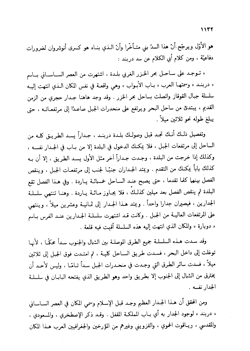 "توجد على ساحل بحر الخزر الغربي بلدة، اشتهرت من العصر الساساني باسم "دربند" وسمتها العرب "باب الأبواب" وهي واقعة في نفس المكان الذي انتهت إليه سلسلة جبال القوقاز واتصلت بساحل بحر الخزر. وقد وجد هاهنا جدار حجري من الزمن القديم، يبتدئ من ساحل البحر ويرتفع على منحدرات الجبل صاعدًا إلى مرتفعاته، حتى يبلغ طوله نحو ثلاثين ميلًا.