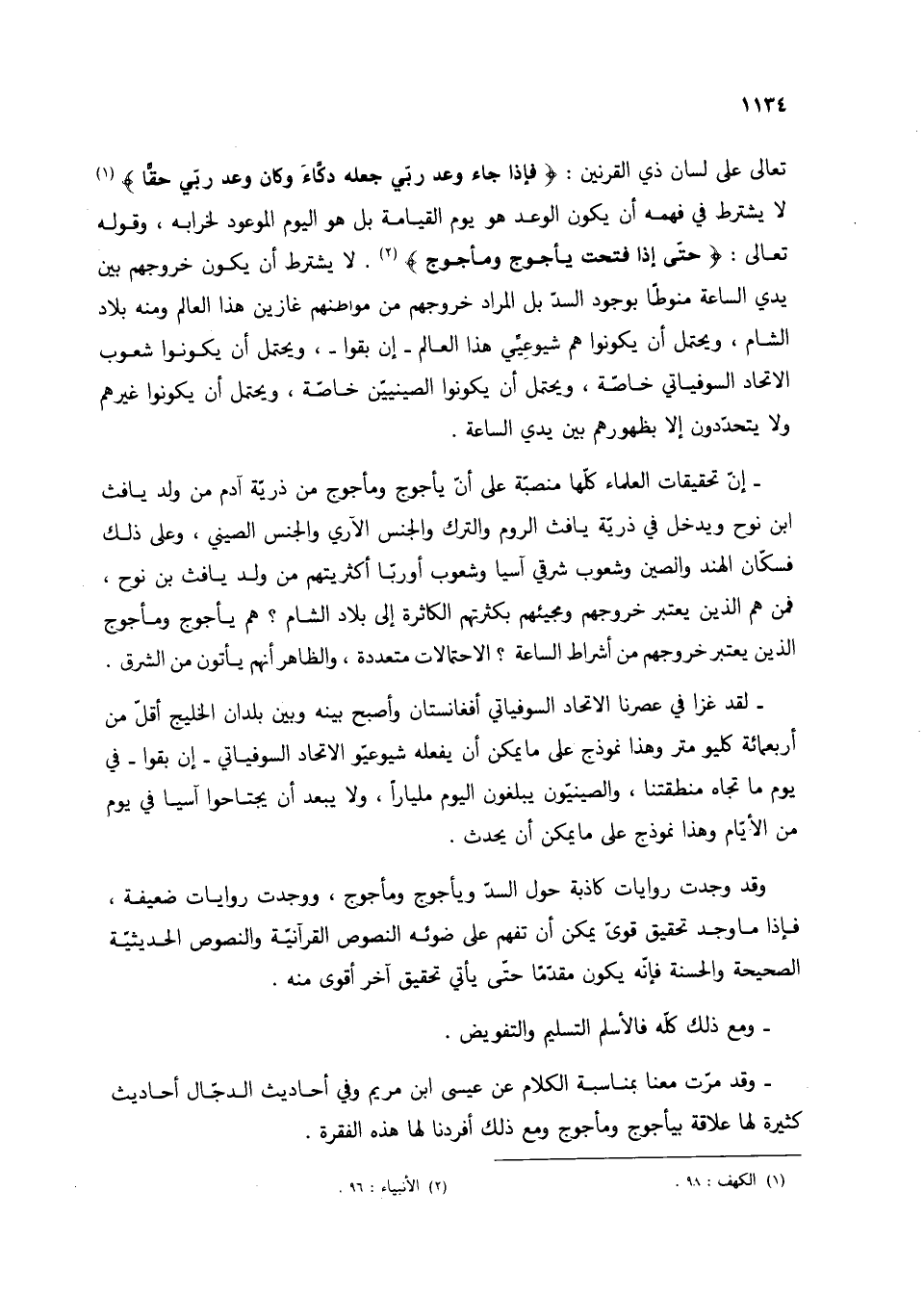 تعالى على لسان ذي القرنين: {قَالَ هَذَا رَحْمَةٌ مِنْ رَبِّي فَإِذَا جَاءَ وَعْدُ رَبِّي جَعَلَهُ دَكَّاءَ وَكَانَ وَعْدُ رَبِّي حَقًّا} (1) لا يشترط في فهمه أن يكون الوعد هو يوم القيامة بل هو اليوم الموعود لخرابه، وقوله تعالى: {حَتَّى إِذَا فُتِحَتْ يَأْجُوجُ وَمَأْجُوجُ} (2). لا يشترط أن يكون خروجهم بين يدي الساعة منوطًا بوجود السد بل المراد خروجهم من مواطنهم غازين هذا العالم ومنه بلاد الشام، ويحتمل أن يكونوا هم شيوعي هذا العالم -إن بقوا-، ويحتمل أن يكونوا شعوب الاتحاد السوفياتي خاصة، ويحتمل أن يكونوا الصينيين خاصة، ويحتمل أن يكونوا غيرهم ولا يتحددون إلا بظهورهم بين يدي الساعة.