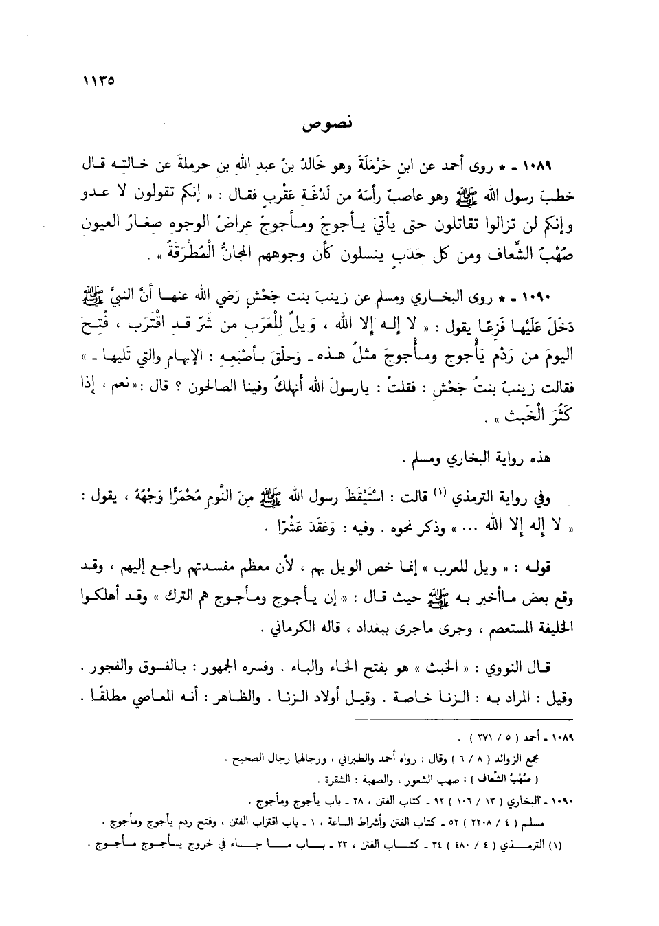 1089 - * روى أحمد عن ابن حرملة وهو خالد بن عبد الله بن حرملة عن خالته قال خطب رسول الله صلى الله عليه وسلم وهو عاصب رأسه من لدغة عقرب فقال: "إنكم تقولون لا عدو وإنكم لن تزالوا تقاتلون حتى يأتي يأجوج ومأجوج عراض الوجوه صغار العيون صهب الشعاف ومن كل حدب ينسلون كأن وجهوهم المجان المطرقة".