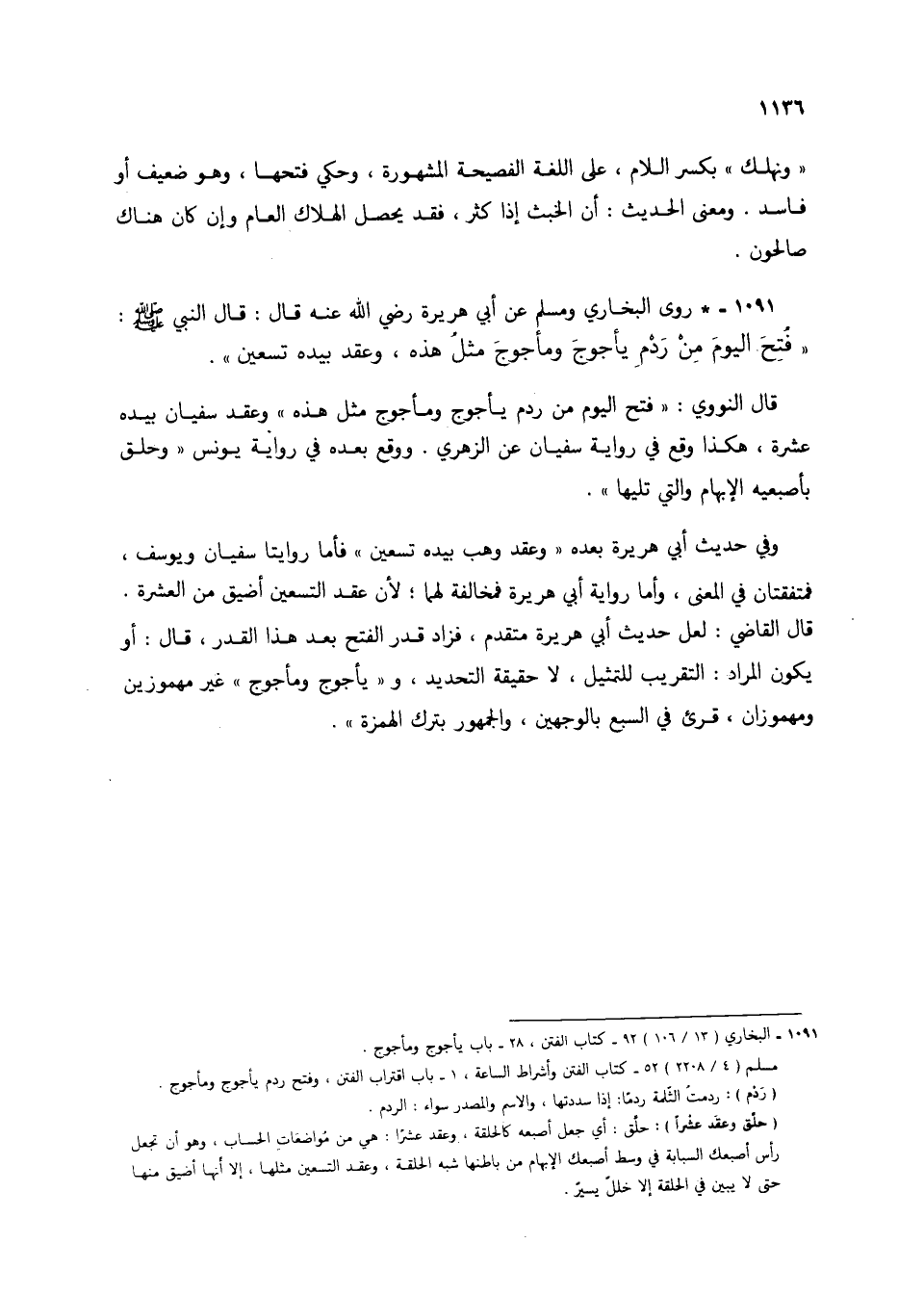 1091 - * روى البخاري ومسلم عن أبي هريرة رضي الله عنه قال: قال النبي صلى الله عليه وسلم: "فتح اليوم من ردم يأجوج ومأجوج مثل هذه، وعقد بيده تسعين".
