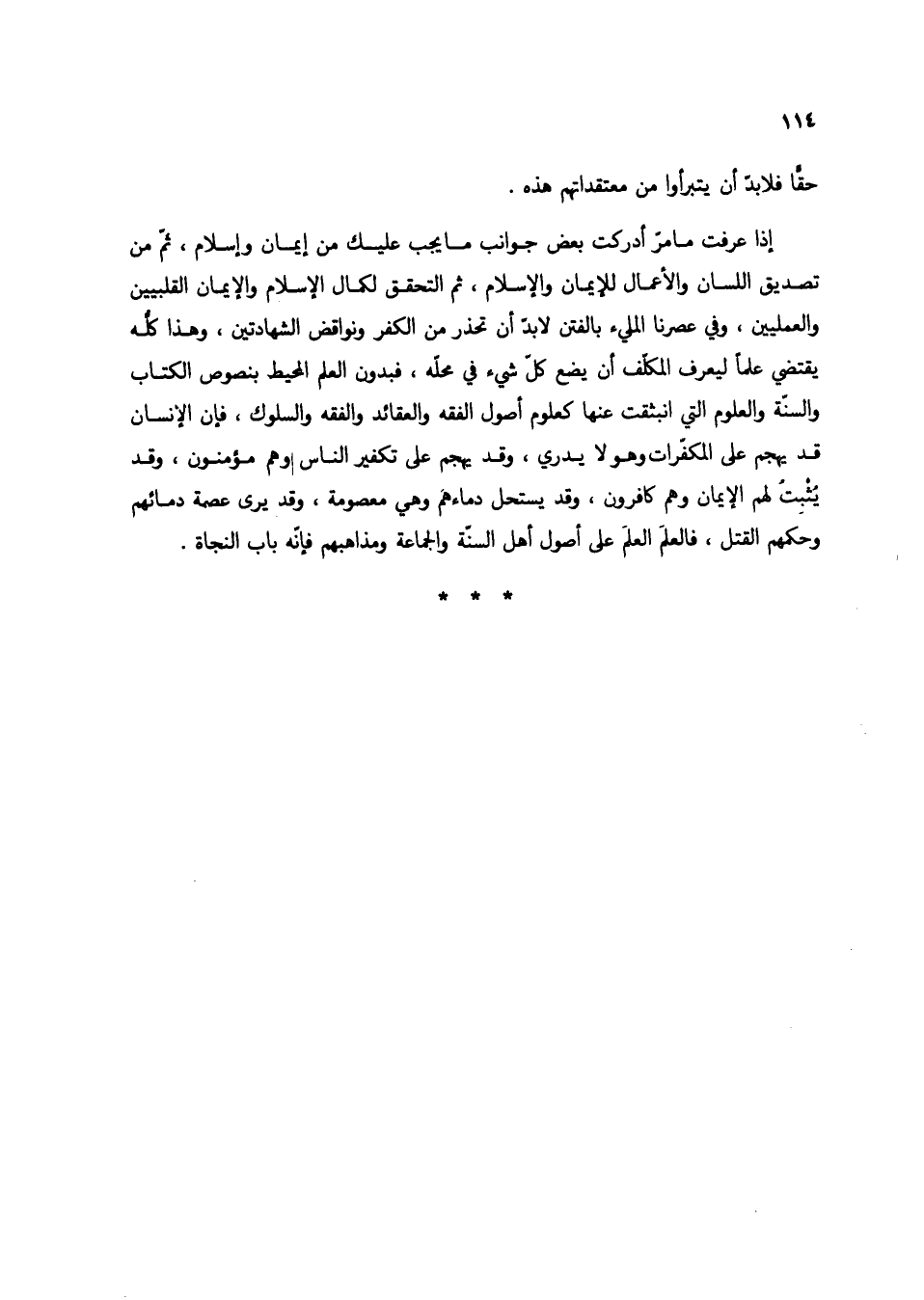 إذا عرفت ما مر أدركت بعض جوانب ما يجب عليك من إيمان وإسلام، ثم من تصديق اللسان والأعمال للإيمان والإسلام، ثم التحقق لكمال الإسلام والإيمان والقلبيين والعلميين، وفي عصرنا المليء بالفتن لابد أن تحذر من الكفر ونواقض الشهادتين، وهذا كله يقتضي علماً ليعرف المكلف أن يضع كل شيء في محله، فبدون العلم المحيط بنصوص الكتاب والسنة والعلوم التي انبثقت عنها كعلوم أصول الفقه والعقائد والفقه والسلوك، فإن الإنسان قد يهجم على المكفرات وهو لا يدري، وقد يهجم على تكفير الناس وهم مؤمنون، وقد يثبت لهم الإيمان وهم كافرون، وقد يستحل دمائهم وهي معصومة، وقد يرى عصمة دمائهم وحكمهم القتل، فالعلم العلم على أصول أهل السنة والجماعة ومذاهبهم فإنه باب النجاة.