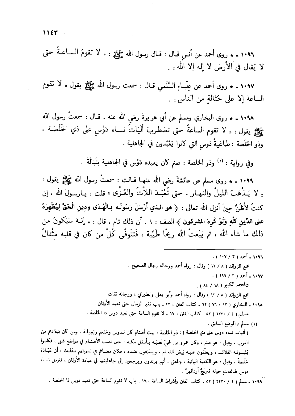 1096 - * روى أحمد عن أنس قال: قال رسول الله صلى الله عليه وسلم: "لا تقوم الساعة حتى لا يقال في الأرض لا إله إلا الله".