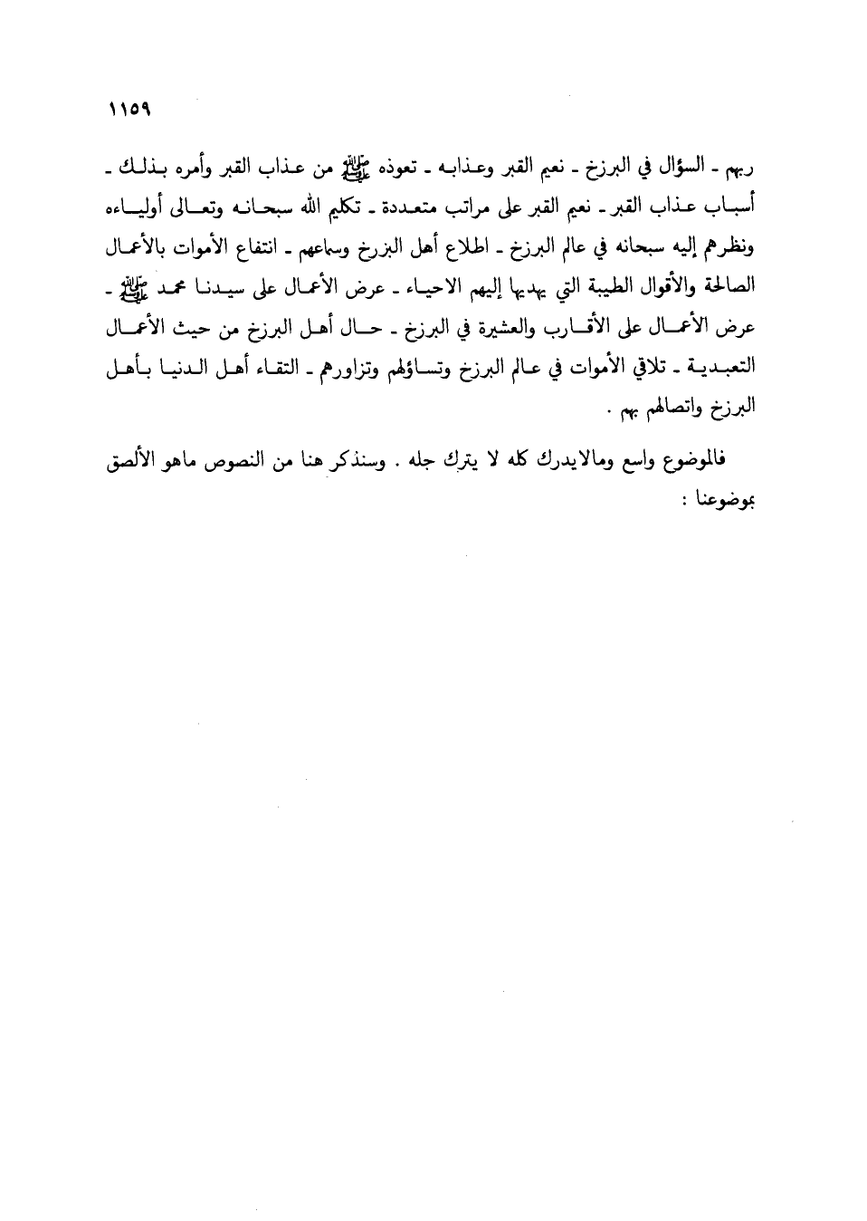 ربهم- السؤال في البرزخ- نعيم القبر وعذابه- تعوذه صلى الله عليه وسلم من عذاب القبر وأمره بذلك- أسباب عذاب القبر- نعيم القبر على مراتب متعددة- تكليم الله سبحانه وتعالى أولياءه ونظرهم إليه سبحانه في عالم البرزخ- اطلال أهل البرزخ وسماعهم- انتفاع الأموات بالأعمال الصالحة والأقوال الطيبة التي يهديها إليهم الاحياء- عرض الأعمال على سيدنا محمد صلى الله عليه وسلم- عرض الأعمال على الأقارب والعشيرة في البرزخ- حال أهل البرزخ من حيث الأعمال التعبدية- تلاقي الأموات في عالم البرزخ وتساؤلهم وتزاورهم- التقاء أهل الدنيا بأهل البرزخ واتصالهم بهم.