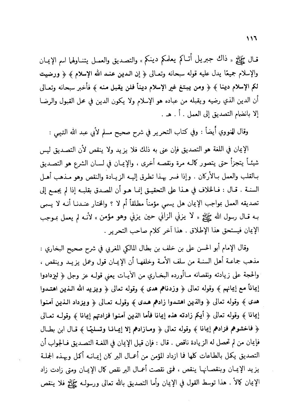 وقال الإمام أبو الحسن علي بن خلف بن بطال المالكي في شرح صحيح البخاري: مذهب جماعة أهل السنة من سلف الأمة وخلفها أن الإيمان قول وعمل يزيد وينقص، والحجة على زيادته ونقصانه ما أورده البخاري من الآيات يعني قوله عز وجل {لِيَزْدَادُوا إِيمَانًا مَعَ إِيمَانِهِمْ} وقوله تعالى {وَزِدْنَاهُمْ هُدًى} وقوله تعالى {وَيَزِيدُ اللَّهُ الَّذِينَ اهْتَدَوْا هُدًى} وقوله تعالى {وَالَّذِينَ اهْتَدَوْا زَادَهُمْ هُدًى} وقوله تعالى {وَيَزْدَادَ الَّذِينَ آمَنُوا إِيمَانًا} وقوله تعالى {أَيُّكُمْ زَادَتْهُ هَذِهِ إِيمَانًا فَأَمَّا الَّذِينَ آمَنُوا فَزَادَتْهُمْ إِيمَانًا} وقوله تعالى {فَاخْشَوْهُمْ فَزَادَهُمْ إِيمَانًا} وقوله تعالى {وَمَا زَادَهُمْ إِلَّا إِيمَانًا وَتَسْلِيمًا} قال ابن بطال فإيمان من لم تحصل له الزيادة نقص. قال: فإن قيل الإيمان في اللغة التصديق فالجواب أن التصديق يكمل بالطاعات كلها فما ازداد المؤمن من أعمال البر كان إيمانه أكمل وبهذه الجملة يزيد الإيمان وينقصانها ينقص، فمتى نقصت أعمال البر نقص كمال الإيمان ومتى زادت زاد الإيمان كمالاً. هذا توسط القول في الإيمان وأما التصديق بالله تعالى ورسول صلى الله عليه وسلم فلا ينقص