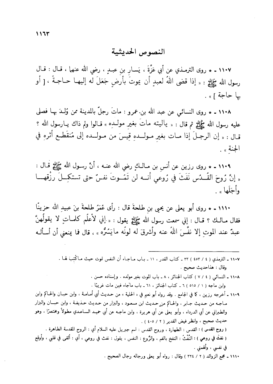 1109 - * روى رزين عن أنس بن مالك رضي الله عنه، أن رسول الله صلى الله عليه وسلم قال: "إن روح القدس نفث في روعي أنه لن تموت نفس حتى تستكمل رزقها وأجلها".