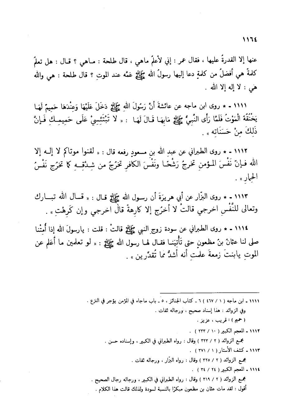 1112 - * روى الطبراني عن عبد الله بن مسعود رفعه قال: "لقنوا موتاكم لا إله إلا الله فإن نفي المؤمن تخرج رشحا ونفس الكافر تخرج من شدقه كما تخرج نفس الحمار".