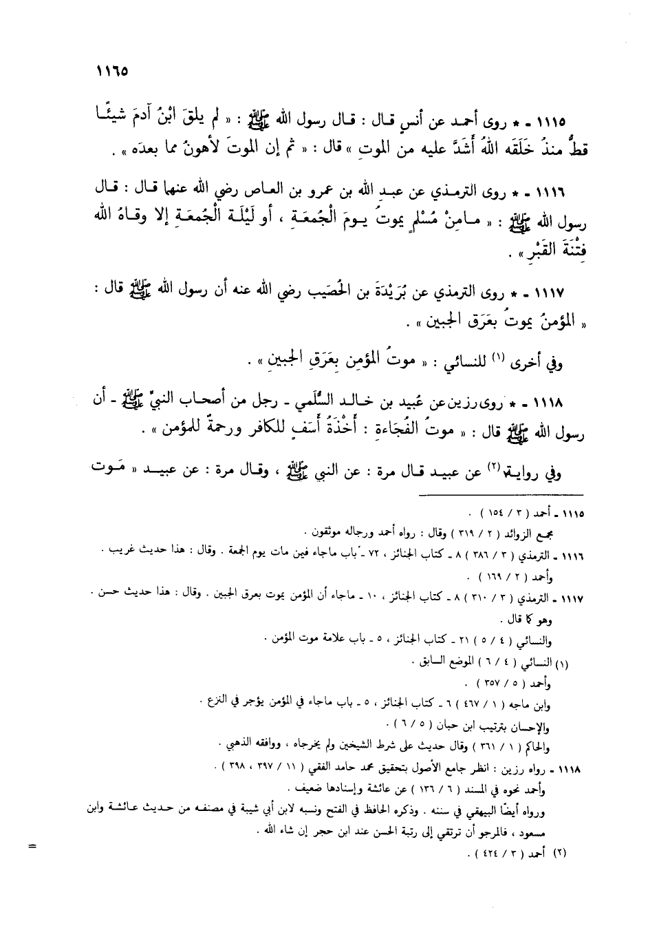 1117 - * روى الترمذي عن بريدة بن الحصيب رضي الله عنه أن رسول الله صلى الله عليه وسلم قال: "المؤمن يموت بعرق الجنين".