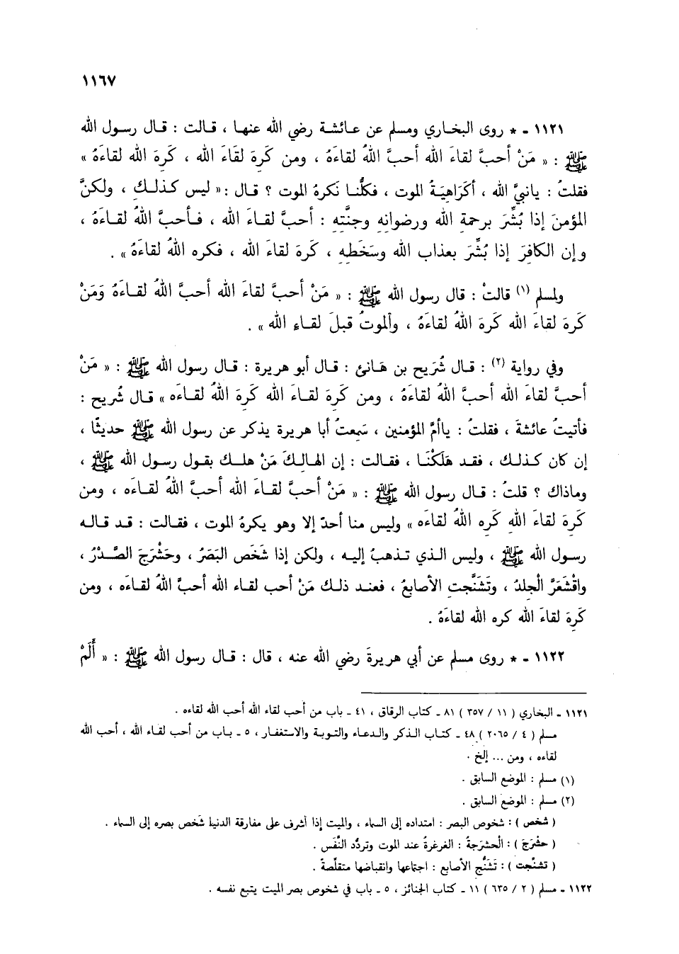 1121 - * روى البخاري ومسلم عن عائشة رضي الله عنهما، قالت: قال رسول الله صلى الله عليه وسلم: "من أحب لقاء الله أحب الله لقاءه، ومن كره لقاء الله كره الله لقاءه" فقلت: يا نبي الله، أكراهية الموت، فكلنا نكره الموت؟ قال: "ليس كذلك، ولكن المؤمن إذا بشر برحمة الله ورضوانه وجنته: أحب لقاء الله، فأحب الله لقاءه، وإن الكافر إذا بشر بعذاب الله وسخطه، كره لقاء الله، فكره الله لقاءه".