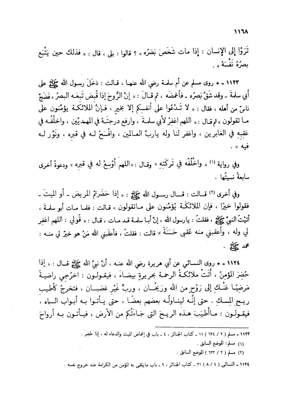 1123 - * روى مسلم عن أم سلمة رصي الله عنهما، قالت: دخل رسول الله صلى الله عليه وسلم على أبي سلمة- وقد شق بصره- فأغمضه، ثم قال: "إن الروح إذا قبض تبعه البصر" فضج ناس من أهله، فقال: "لا تدعوا على أنفسكم إلا بخير، فإن الملائكة يؤمنون على ما تقولون" ثم قال: "اللهم اغفر لأبي سلمة، وارفع درجته في المهديين، واخلفه في عقبه في الغابرين، واغفر لنا وله يا رب العالمين، وافسح له في القبور، ونور له فيه".