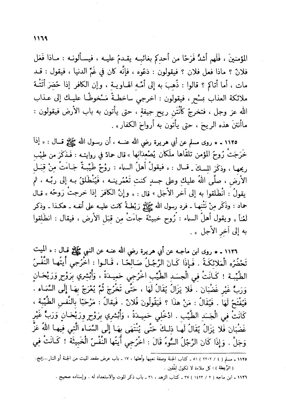 1125 - * روى مسلم عن أبي هريرة رضي الله عنه، أن رسول الله صلى الله عليه وسلم قال: "إذا خرجت روح المؤمن تلقاها ملكان يصعدانها" قال حماد في روايته: فذكر من طيب ريحها، وذكر المسك- قال: "فيقول أهل السماء: روح طيبة جاءت من قبل الأرض، صلى الله عليك وعلى جسد كنت تعمرينه، فينطلق به إلى ربه، ثم يقول: انطلقوا به إلى آخر الأجل" قال: "وإن الكافر إذا خرجت روحه" قال حماد: وذكر من نتنها- فرد رسول الله صلى الله عليه وسلم ريطة كانت عليه على أنفه- هكذا- وذكر لعنا "ويقول أهل السماء: روح خبيثة جاءت من قبل الأرض، فيقال: انطلقوا به إلى آخر الأجل".