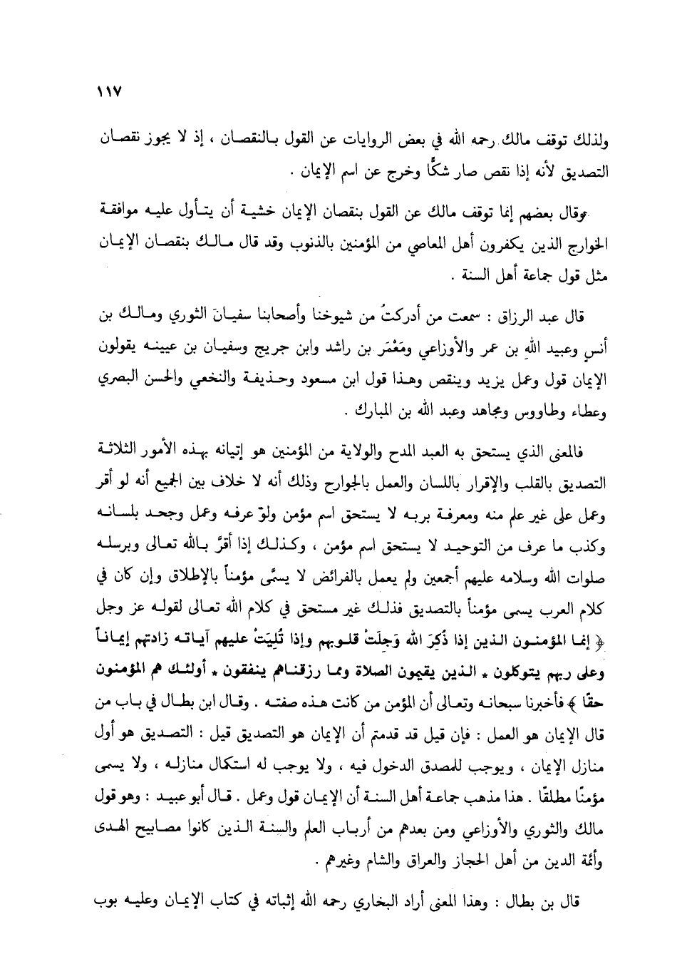 ولذلك توقف مالك رحمه الله في بعض الروايات عن القول بالنقصا، إذ لا يجوز نقصان التصديق لأنه إذا نقص صار شكا وخرج عن اسم الإيمان.