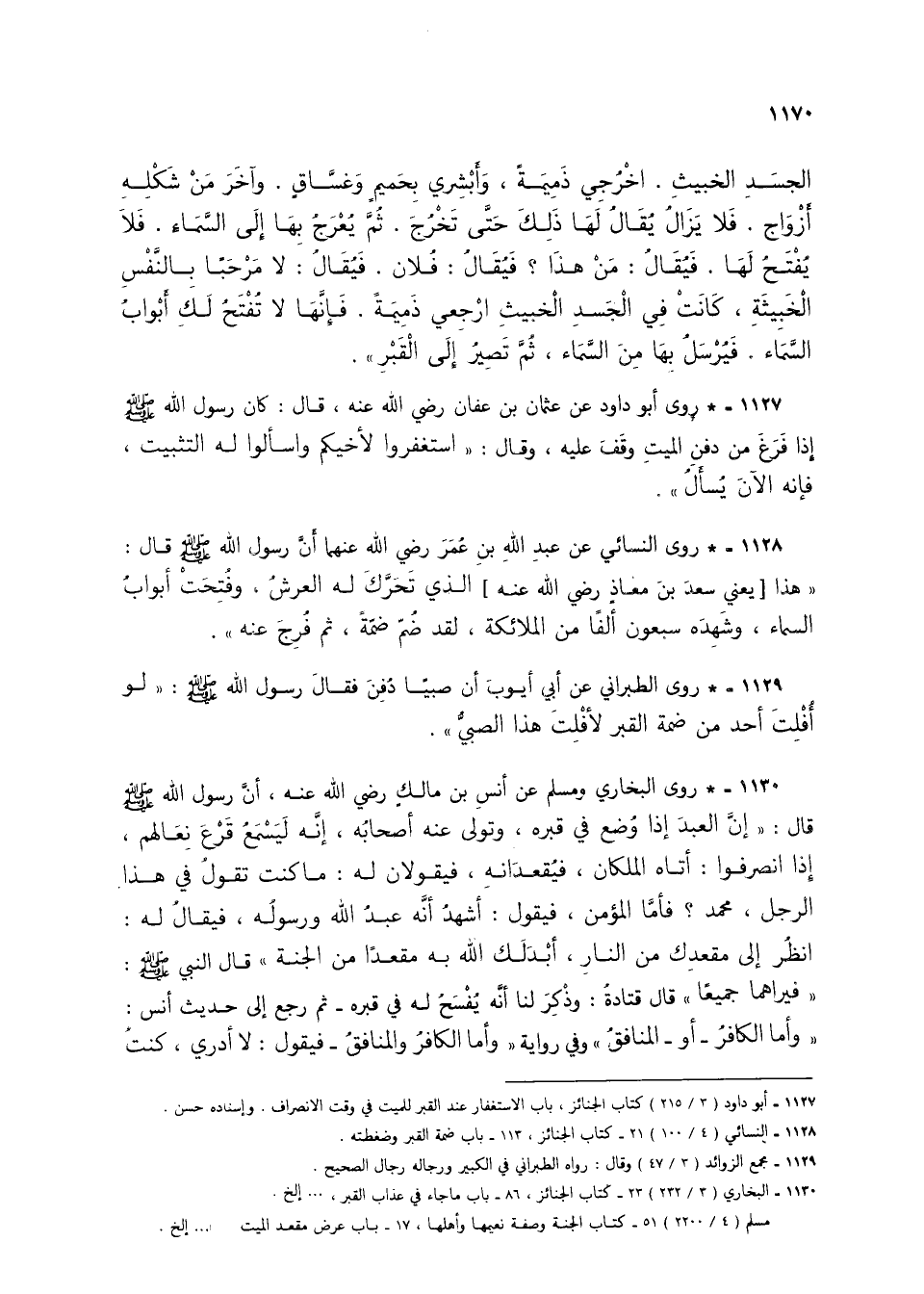 1127 - * روى أبو داود عن عثمان بن عفان رضي الله عنه، قال: كان رسول الله صلى الله عليه وسلم إذا فرغ عن دفن الميت وقف عليه، وقال: "استغفروا لأخيكم واسألوا له التثبيت، فإنه الأن يسأل".