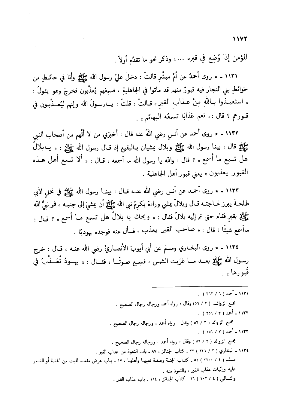 1132 - * روى أحمد عن أنس رضي الله عنه قال: أخبرني من لا أتهم من أصحاب النبي صلى الله عليه وسلم قال: بينما رسول الله صلى الله عليه وسلم وبلال يمشيان بالبقيع إذ قال رسول الله صلى الله عليه وسلم: "يا بلال هل تسمع ما أسمع"؟ قال: والله يا رسول الله ما أسمعه، قال: "ألا تسمع أهل هذه القبور يعذبون" يعني قبور أهل الجاهلية.