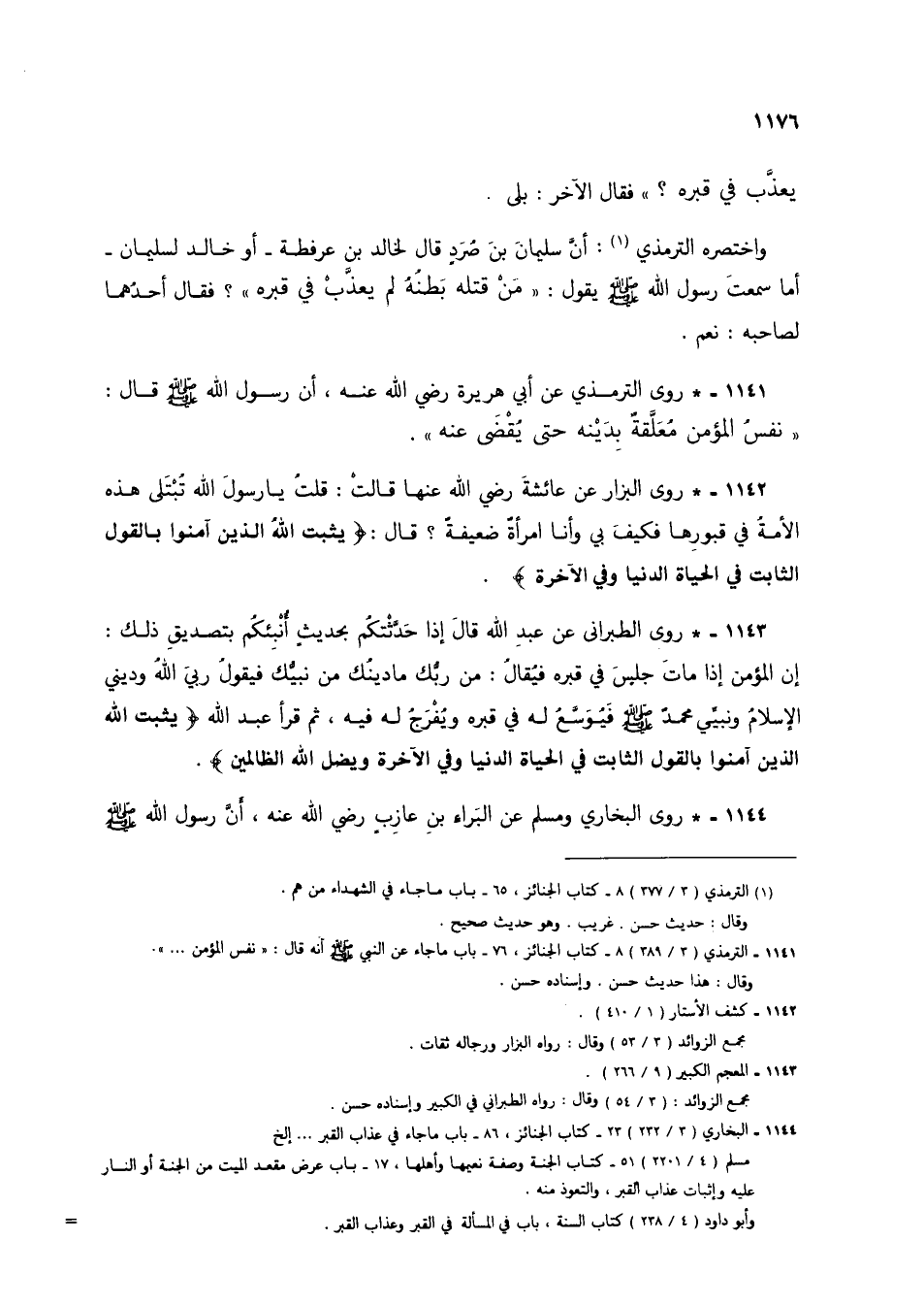 1142 - * روى البزار عن عائشة رضي الله عنها قالت: قلت يا رسول الله تبتلى هذه الأمة في قبورها فكيف بي وأنا امرأة ضعيفة؟ قال: {يُثَبِّتُ اللَّهُ الَّذِينَ آمَنُوا بِالْقَوْلِ الثَّابِتِ فِي الْحَيَاةِ الدُّنْيَا وَفِي الْآخِرَةِ}.