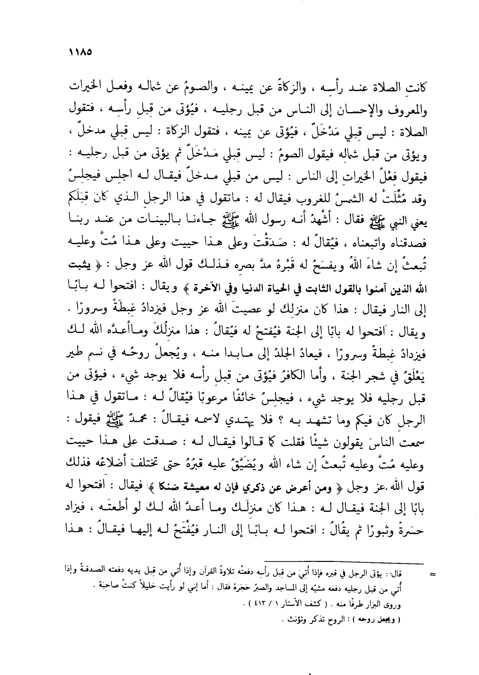 كانت الصلاة عند رأسه، والزكاة عن يمينه، والصوم عن شماله وفعل الخيرات والمعروف والإحسان إلى الناس من قبل رجليه، فيؤتي من قبل رأسه، فتقول الصلاة: ليس قبلي مدخل، فيؤتي عن يمينه، فتقول الزكاة: ليس قبلي مدخل، ويؤتي من قبل شماله فيقول الصوم: ليس قبلي مدخل ثم يؤتى من قبل رجليه: فيقول فعل الخيرات إلى الناس: ليس من قبلي مدخل فيقال له أجلس فيجلس وقد مثلت له الشمس للغروب فيقال له: ما تقول في هذا الرجل الذي كان قبلكم يعني النبي صلى الله عليه وسلم فقال: أشهد أنه رسول الله صلى الله عليه وسلم جاءنا بالبينات من عند ربنا فصدقناه واتبعناه، فيقال له: صدقت وعلى هذا حييت وعلى هذا مت وعليه تبعث إن شاء الله ويفسح له قبره مد بصره فذلك قول الله عز وجل: {يُثَبِّتُ اللَّهُ الَّذِينَ آمَنُوا بِالْقَوْلِ الثَّابِتِ فِي الْحَيَاةِ الدُّنْيَا وَفِي الْآخِرَةِ} ويقال: افتحوا له بابا إلى النار فيقال: هذا كان منزلك لو عصيت الله عز وجل فيزداد غبطة وسرورا. ويقال: افتحوا له بابا إلى الجنة فيفتح له فيقال: هذا منزلك وما أعده الله لك فيزداد غبطةٌ وسروراً، فيعاد الجلد إلى ما بدا منه، ويجعل روحه في نسم طير يعلق في شجر الجنة، وأما الكافر فيؤتي من قبل رأسه فلا يوجد شيء، فيؤتي من قبل رجليه فلا يوجد شيء، فيجلس خائفًا مرعوبًا فيقال له: ما تقول في هذا الرجل كان فيكم وما تشهد به؟ فلا يهتدي لاسمه فيقال: محمد صلى الله عليه وسلم فيقول: سمعت الناس يقولون شيئًا فقلت كما قالوا فيقال له: صدقت على هذا حييت وعليه مت وعليه تبعث إن شاء الله ويضيق عليه قبره حتي تختلف أضلاعه فذلك قول الله عز وجل: {وَمَنْ أَعْرَضَ عَنْ ذِكْرِي فَإِنَّ لَهُ مَعِيشَةً ضَنْكًا} فيقال: افتحوا له بابا إلى الجنة فيقال له: هذا كان منزلك وما أعد الله لك لو أطعته، فيزاد حسرة وثبورا ثم يقال: افتحوا له بابا إلى النار فيفتح له إليها فيقال: هذا