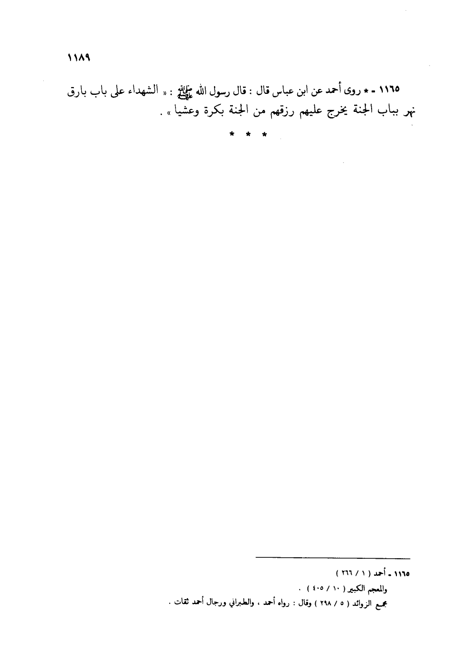 1165 - * روى أحمد عن ابن عباس قال: قال رسول الله صلى الله عليه وسلم: "الشهداء على باب بارق نهر بباب الجنة يخرج عليهم رزقهم من الجنة بكرة وعشيا".