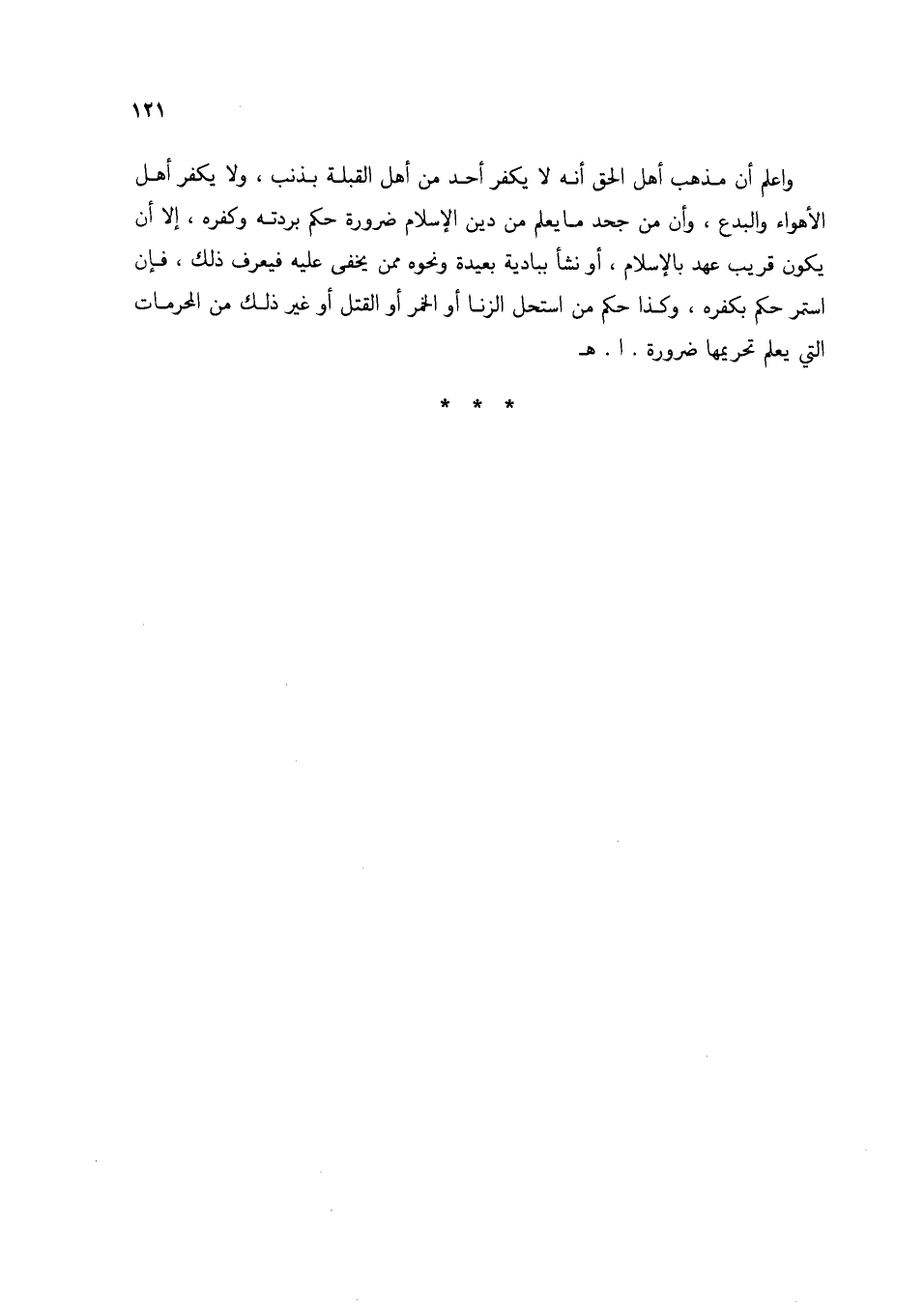 واعلم أن مذهب أهل الحق أنه لا يكفر أحد من أهل القبلة بذنب، ولا يكفر أهل الأهواء والبدع، وأن من جحد ما يعلم من دين الإسلام ضرورة حكم بردته وكفره، إلا أن يكون قريب عهد بالإسلام، أو نشأ ببادية ونحوه ممن يخفي عليه فيعرف ذلك، فإن استمر حكم بكفره، وكذا حكم من استحل الزنا أو الخمر أو القتل أو غير ذلك من المخرمات التي يعلم تحريمها ضرورة. أ. هـ.