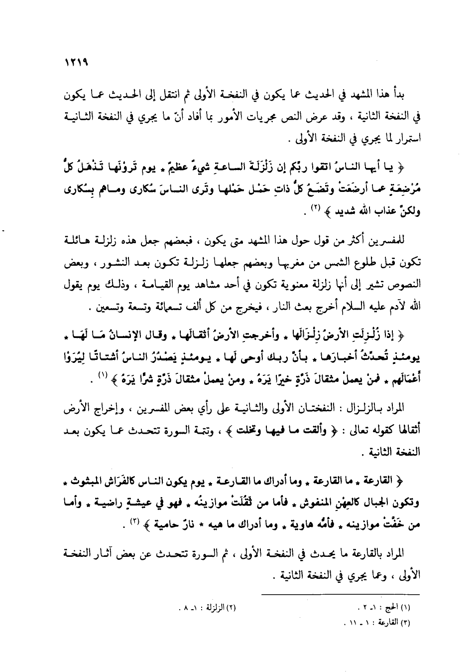 {إِذَا زُلْزِلَتِ الْأَرْضُ زِلْزَالَهَا * وَأَخْرَجَتِ الْأَرْضُ أَثْقَالَهَا * وَقَالَ الْإِنْسَانُ مَا لَهَا * يَوْمَئِذٍ تُحَدِّثُ أَخْبَارَهَا * بِأَنَّ رَبَّكَ أَوْحَى لَهَا * يَوْمَئِذٍ يَصْدُرُ النَّاسُ أَشْتَاتًا لِيُرَوْا أَعْمَالَهُمْ * فَمَنْ يَعْمَلْ مِثْقَالَ ذَرَّةٍ خَيْرًا يَرَهُ * وَمَنْ يَعْمَلْ مِثْقَالَ ذَرَّةٍ شَرًّا يَرَهُ} (2). المراد بالزلزال: النفختان الأولى والثانية على رأي بعض المفسرين، وإخراج الأرض أثقالها كقوله تعالى: {وَأَلْقَتْ مَا فِيهَا وَتَخَلَّتْ}، وتتمة السورة تتحدث عما يكون بعد النفخة الثانية.