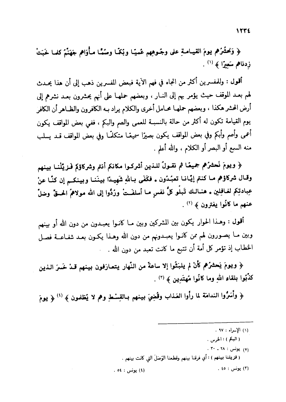 أقول: وللمفسرين أكثر من اتجاه في فهم الآية فبعض المفسرين ذهب إلى أن هذا يحدث لهم بعد الموقف حيث يؤمر بهم إلى النار، وبعضهم حملها على أنهم يحشرون بعد نشرهم إلى أرض المحشر هكذا، وبعضهم حملها محامل أخرى والكلام يراد به الكافرون والظاهر أن الكافر يوم القيامة تكون له أكثر من حالة بالنسبة للعمى والصم والبكم، ففي بعض المواقف يكون أعمى وأصم وأبكم وفي بعض المواقف يكون بصيرًا سميعًا متكلمًا وفي بعض المواقف قد يسلب منه السمع أو البصر أو الكلام. والله أعلم.