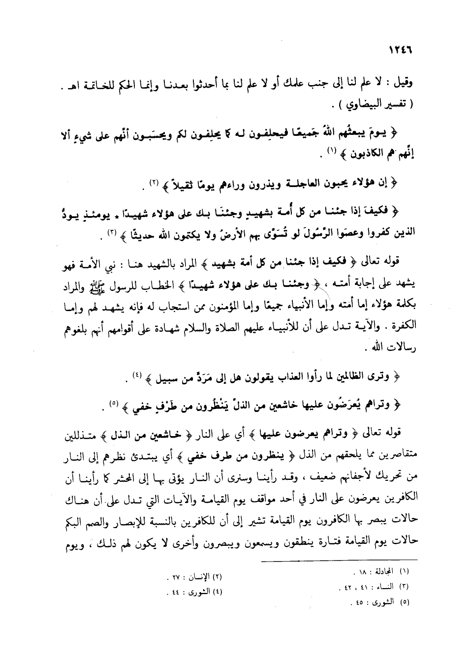 {فَكَيْفَ إِذَا جِئْنَا مِنْ كُلِّ أُمَّةٍ بِشَهِيدٍ وَجِئْنَا بِكَ عَلَى هَؤُلَاءِ شَهِيدًا * يَوْمَئِذٍ يَوَدُّ الَّذِينَ كَفَرُوا وَعَصَوُا الرَّسُولَ لَوْ تُسَوَّى بِهِمُ الْأَرْضُ وَلَا يَكْتُمُونَ اللَّهَ حَدِيثًا} (3).