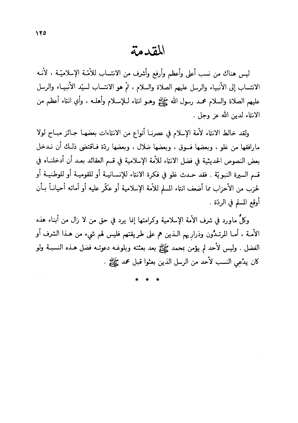 ولقد خالط الانتماء لأمة الإسلام في عصرنا أنواع من الانتماءات بعضها جائز مباح لولا ما رافقها من غلو، وبعضها فوق، وبعضها ضلال، وبعضها ردة فاقتضى ذلك أن ندخل بعض النصوص الحديثية في فضل الانتماء للأمة الإسلامية في قسم العقائد بعد أن أدخلناه في قسم السيرة النبوية. فقد حدث غلو في فكرة الانتماء للإنسانية أو للقومية أو للوطنية أو لحزب من الأحزاب مما أضعف انتماء المسلم للأمة الإسلامية أو عكر عليه أو أماته أحيانا بأن أوقع المسلم في الردة.