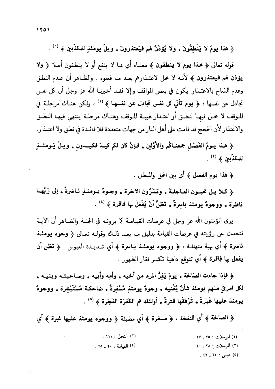 قوله تعالى {هَذَا يَوْمُ لَا يَنْطِقُونَ} معناه أي بما لا ينفع أو لا ينطقون أصلا {وَلَا يُؤْذَنُ لَهُمْ فَيَعْتَذِرُونَ} لأنه لا محل لاعتذارهم بعد ما فعلوه. والظاهر أن عدم النطق وعدم السماح بالاعتذار يكون في بعض المواقف وإلا فقد أخبرنا الله عز وجل أن كل نفس تجادل عن نفسها: {يَوْمَ تَأْتِي كُلُّ نَفْسٍ تُجَادِلُ عَنْ نَفْسِهَا} (2)، ولكن هناك مرحله في الموقف لا محل فيها لنطق أو اعتذار لهيبة الموقف وهناك مرحلة ينتهي فيها النطق والاعتذار لأن الحجج قد قامت على أهل النار من جهات متعددة فلا فائدة في نطق ولا اعتذار.