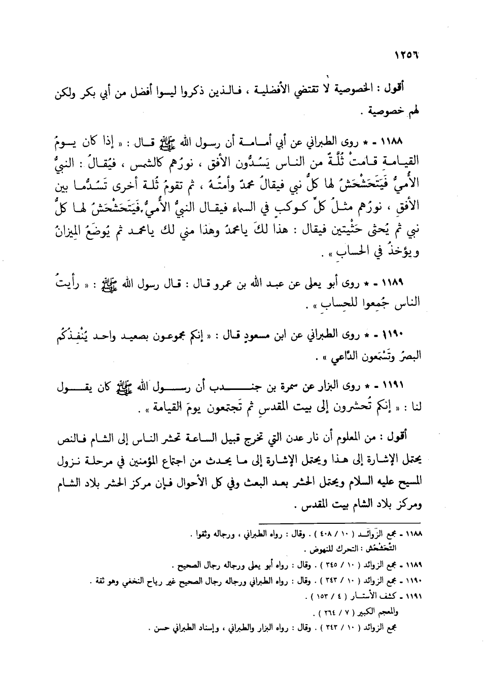 1188 - * روى الطبراني عن أبى أمامة أن رسول الله صلى الله عليه وسلم قال: "إذا كان يوم القيامة قامت ثلة من الناس يسدون الأفق، نورهم كالشمس، فيقال: النبي الأمي فيتحشحش لها كل نبي فيقال محمد وأمته، ثم تقوم ثلة أخرى تسدما بين الأفق، نورهم مثل كل كوكب في السماء فيقال النبي الأمي فيتحشحش لها كل نبي ثم يحثى حثيتين فيقال: هذا لك يا محمد وهذا منى لك يا محمد ثم يوضع المزان ويؤخذ في الحساب".