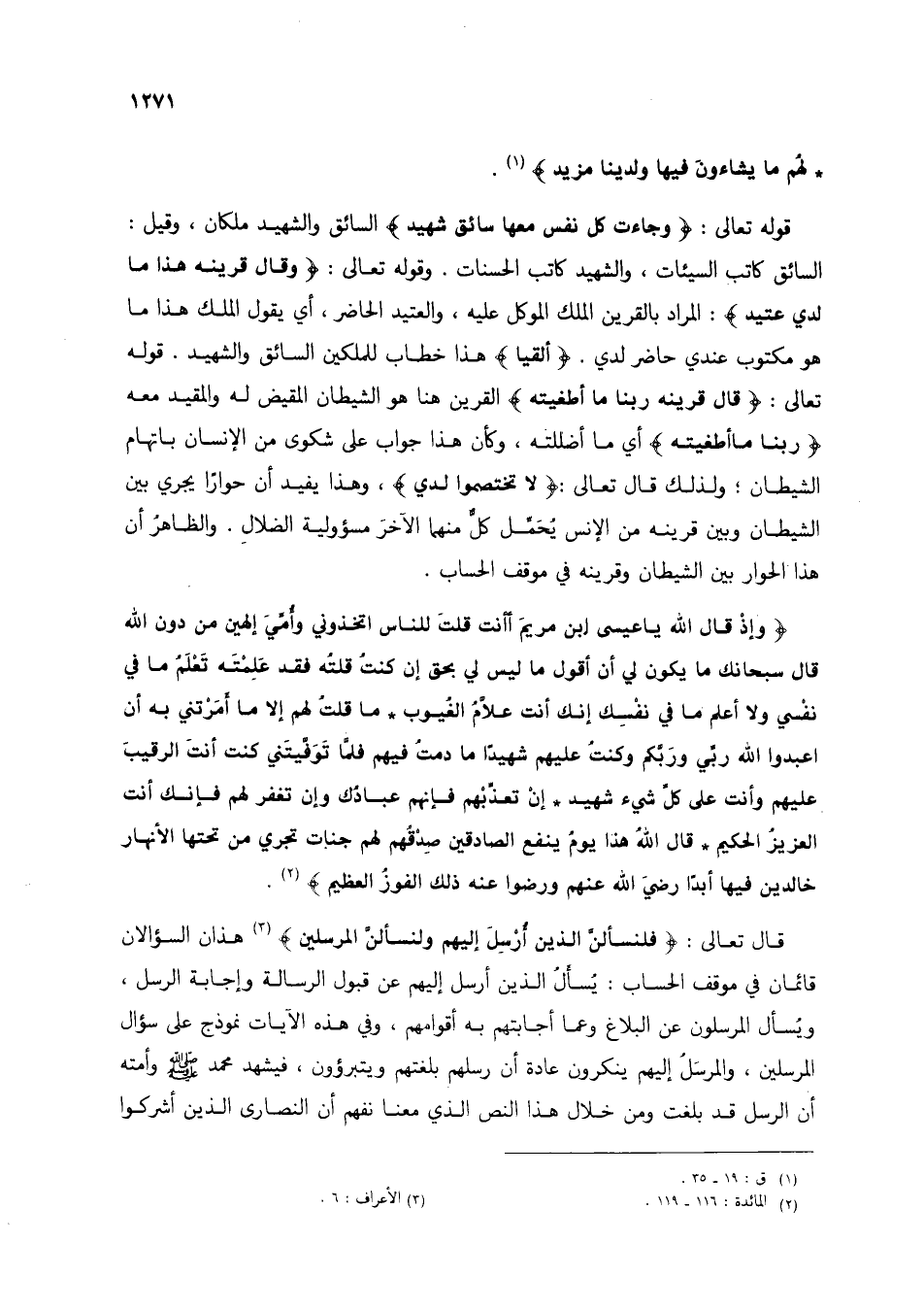 قوله تعالى: {وَجَاءَتْ كُلُّ نَفْسٍ مَعَهَا سَائِقٌ وَشَهِيدٌ} السائق والشهيد ملكان، وقيل: السائق كاتب السيئات، والشهيد كاتب الحسنات. وقوله تعالى: {وَقَالَ قَرِينُهُ هَذَا مَا لَدَيَّ عَتِيدٌ}: المراد بالقرين الملك الموكل عليه، والعتيد الحاضر، أي يقول الملك هذا ما هو مكتوب عندي حاضر لدي. {أَلْقِيَا} هذا خطاب للملكين السائق والشهيد. قوله تعالى: {قَالَ قَرِينُهُ رَبَّنَا مَا أَطْغَيْتُهُ} القرين هنا هو الشيطان المقيض له والمقيد معه {رَبَّنَا مَا أَطْغَيْتُهُ} أي ما أضللته، وكأن هذا جواب على شكوى من الإنسان باتهام الشيطان؛ ولذلك قال تعالى: {قَالَ لَا تَخْتَصِمُوا لَدَيَّ}، وهذا يفيد أن حوارًا يجري بين الشيطان وبين قرينه من الإنس يحمل كل منهما الآخر مسؤولية الضلال. والظاهر أن هذا الحوار بين الشيطان وقرينه في موقف الحساب.