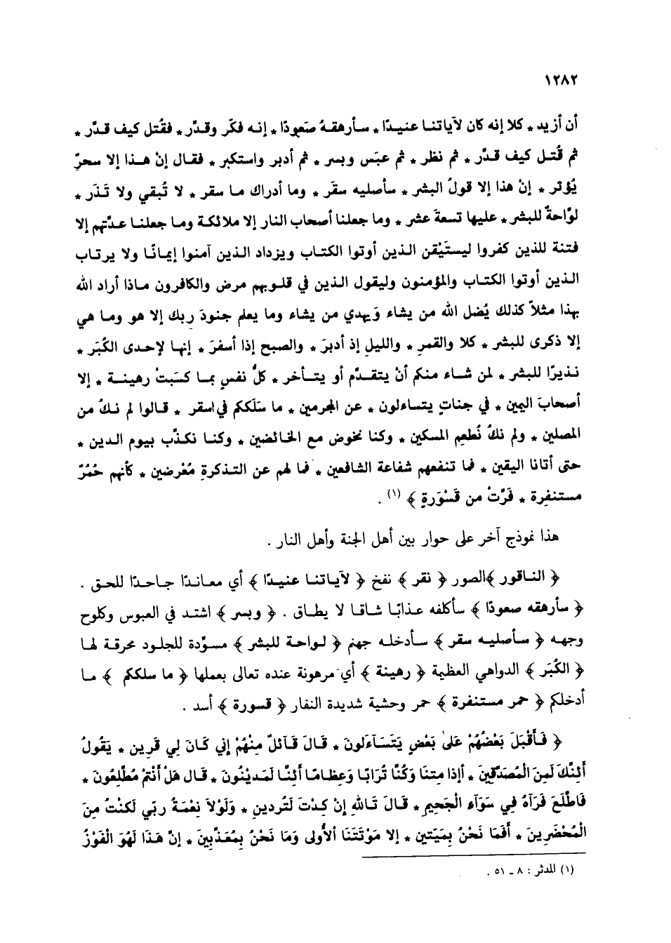 أَنْ أَزِيدَ * كَلَّا إِنَّهُ كَانَ لِآيَاتِنَا عَنِيدًا * سَأُرْهِقُهُ صَعُودًا * إِنَّهُ فَكَّرَ وَقَدَّرَ * فَقُتِلَ كَيْفَ قَدَّرَ * ثُمَّ قُتِلَ كَيْفَ قَدَّرَ * ثُمَّ نَظَرَ * ثُمَّ عَبَسَ وَبَسَرَ * ثُمَّ أَدْبَرَ وَاسْتَكْبَرَ * فَقَالَ إِنْ هَذَا إِلَّا سِحْرٌ يُؤْثَرُ * إِنْ هَذَا إِلَّا قَوْلُ الْبَشَرِ * سَأُصْلِيهِ سَقَرَ * وَمَا أَدْرَاكَ مَا سَقَرُ * لَا تُبْقِي وَلَا تَذَرُ * لَوَّاحَةٌ لِلْبَشَرِ * عَلَيْهَا تِسْعَةَ عَشَرَ * وَمَا جَعَلْنَا أَصْحَابَ النَّارِ إِلَّا مَلَائِكَةً وَمَا جَعَلْنَا عِدَّتَهُمْ إِلَّا فِتْنَةً لِلَّذِينَ كَفَرُوا لِيَسْتَيْقِنَ الَّذِينَ أُوتُوا الْكِتَابَ وَيَزْدَادَ الَّذِينَ آمَنُوا إِيمَانًا وَلَا يَرْتَابَ الَّذِينَ أُوتُوا الْكِتَابَ وَالْمُؤْمِنُونَ وَلِيَقُولَ الَّذِينَ فِي قُلُوبِهِمْ مَرَضٌ وَالْكَافِرُونَ مَاذَا أَرَادَ اللَّهُ بِهَذَا مَثَلًا كَذَلِكَ يُضِلُّ اللَّهُ مَنْ يَشَاءُ وَيَهْدِي مَنْ يَشَاءُ وَمَا يَعْلَمُ جُنُودَ رَبِّكَ إِلَّا هُوَ وَمَا هِيَ إِلَّا ذِكْرَى لِلْبَشَرِ * كَلَّا وَالْقَمَرِ * وَاللَّيْلِ إِذْ أَدْبَرَ * وَالصُّبْحِ إِذَا أَسْفَرَ * إِنَّهَا لَإِحْدَى الْكُبَرِ * نَذِيرًا لِلْبَشَرِ * لِمَنْ شَاءَ مِنْكُمْ أَنْ يَتَقَدَّمَ أَوْ يَتَأَخَّرَ * كُلُّ نَفْسٍ بِمَا كَسَبَتْ رَهِينَةٌ * إِلَّا أَصْحَابَ الْيَمِينِ * فِي جَنَّاتٍ يَتَسَاءَلُونَ * عَنِ الْمُجْرِمِينَ * مَا سَلَكَكُمْ فِي سَقَرَ * قَالُوا لَمْ نَكُ مِنَ الْمُصَلِّينَ * وَلَمْ نَكُ نُطْعِمُ الْمِسْكِينَ * وَكُنَّا نَخُوضُ مَعَ الْخَائِضِينَ * وَكُنَّا نُكَذِّبُ بِيَوْمِ الدِّينِ * حَتَّى أَتَانَا الْيَقِينُ * فَمَا تَنْفَعُهُمْ شَفَاعَةُ الشَّافِعِينَ * فَمَا لَهُمْ عَنِ التَّذْكِرَةِ مُعْرِضِينَ * كَأَنَّهُمْ حُمُرٌ مُسْتَنْفِرَةٌ * فَرَّتْ مِنْ قَسْوَرَةٍ} (1).