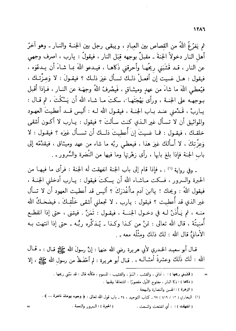 ثم يَفرُغُ الله من القصاص بين العباد، ويبقى رجل بين الجنة والنار- وهو اخر أهل النار دخولا الجنة- مقبل بوجهه قبل النار، فيقول: يارب، اصرف وجهي عن النار، قد قشبني ريحها وأحرقني ذكاها، فيدعو الله بما شاء أن يدعوه، فيقول: هل عسيت إن أفعل ذلك تسأل غير ذلك؟ فبقول: لا وعزتك، فيعطي الله ما شاء من عهد وميثاق، فيصرف الله وجهة عن النار، فإذا أقبل بوجهه على الجنة، ورأى بهجتها، سكت ما شاء الله أن يسكت، ثم قال: يا رب، قدمني عند باب الجنة، فيقول الله له: أليس قد أعطيت العهود والمواثيق أن لا تسأل غير الذي كنت سألت؟ فيقول: يا رب لا أكون أشفى خلقك، فيقول: فما عسيت إن أعطيت ذلك أن تسأل غيره؟ فيقول: لا وعزتك، لا أسألك غير هذا، فيعطى ربه ما شاء من عهد وميثاق، فيقدمه إلى باب الجنة فإذا بلغ بابها، رأى زهرتها وما فيها من النضرة والسرور"