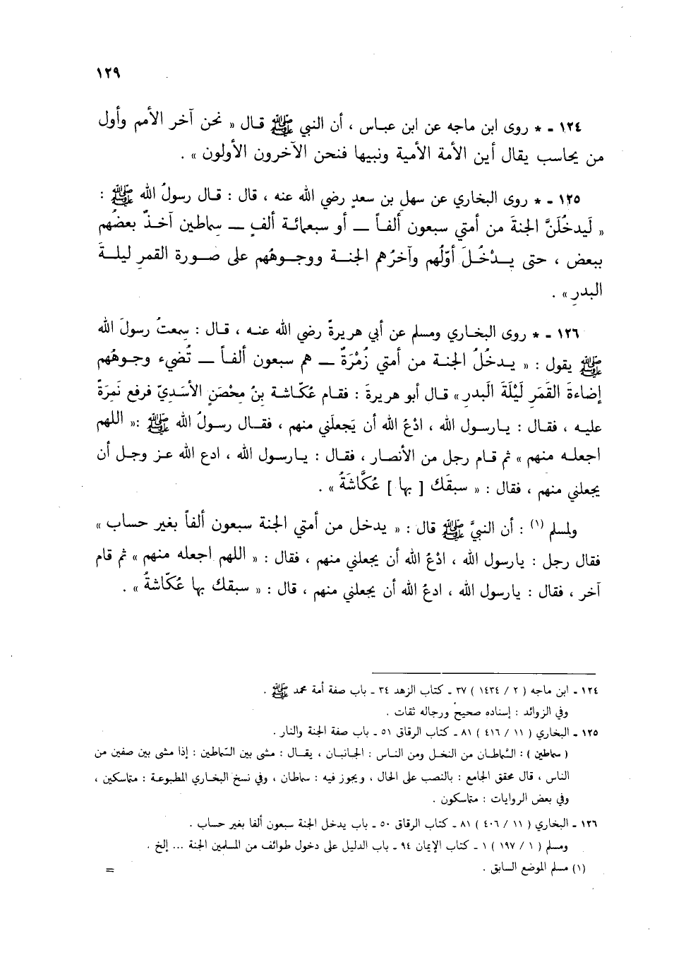 126 - * روى البخاري ومسلم عن أبي هريرة رضي الله عنه، قال: سمعت رسول الله صلى الله عليه وسلم يقول: "يدخل الجنة من أمتي زمرة - هم سبعون ألفاً - تضيء وجوههم إضاءة القمر ليلة البدر" قال أبو هريرة: فقام عكاشة بن محصن الأسدي فرفع نمرة عليه، فقال: يا رسول الله، ادع الله أن يجعلني منهم، فقال رسول الله صلى الله عليه وسلم: "اللهم اجعله منهم" ثم قام رجل من الأنصار، فقال: يا رسول الله، ادع الله عز وجل أن يجعلني منهم، فقال: "سبقك [بها] عكاشة".