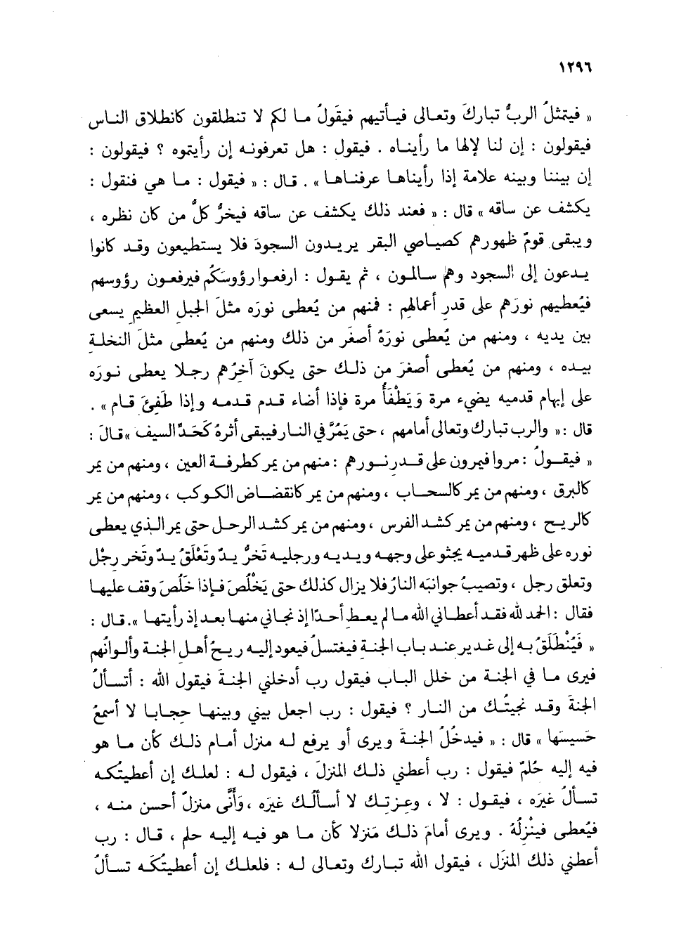 "فيتمثل الرب تبارك وتعالى فيأتيهم فيقول ما لكم لا تنطلقون كانطلاق الناس فيقولون: إن لنا لإلها ما رأيناه. فيقول: هل تعرفونه إن رأيتموه؟ فيقولون: إن بيننا وبينه علامة إذا رأيناها عرفناها". قال: "فيقول: ما هي فنقول: يكشف عن ساقه" قال: "فعند ذلك يكشف عن ساقه فيخر كل من كان نظره ويبقى قوم ظهورهم كصياصي البقر يريدون السجود فلا يستطيعون وقد كانوا يدعون إلى السجود وهم سالمون، ثم يقول: ارفعوا رؤوسكم فيرفعون رؤوسهم فيعطيهم نورهم على قدر أعمالهم: فمنهم من يعطى نوره مثل الجبل العظيم يسعى بين يديه، ومنهم من يعطى نوره أصغر من ذلك ومنهم من يعطى مثل النخلة بيده، ومنهم من يعطى أصغر من ذلك حتى يكون آخرهم رجلا يعطى نوره على إبهام قدميه يضيء مرة ويطفأ مرة فإذا أضاء قدم قدمه وإذا طفئ قام". قال: "والرب تبارك وتعالى أمامهم، حتى يمر في النار فيبقى أثره كحد السيف" قال: "فيقول: مروا فيمرون على قدر نورهم: منهم من يمر كطرفة العين، ومنهم من يمر كالبرق، ومنهم من يمر كالسحاب، ومنهم من يمر كانقضاض الكوكب، ومنهم من يمر كالريح، ومنهم من يمر كشد الفرس، ومنهم من يمر كشد الرحل حتى يمر الذي يعطى نوره على ظهر قدميه يجثو على وجهه ويدية ورجليه تخر يد وتعلق يد وتخر رجل وتعلق رجل، وتصيب جوانبه النار فلا يزال كذلك حتى يخلص فإذا خلص وقف عليها فقال: الحمد لله فقد أعطاني الله ما لم يعط أحدًا إذ نجاني منها بعد إذ رأيتها". قال: "فينطلق به إلى غدير عند باب الجنة فيغتسل فيعود إليه ريح أهل الجنة وألوانهم فيرى ما في الجنة من خلل الباب فيقول رب أدخلني الجنة فيقول الله: أتسأل الجنة وقد نجيتك من النار؟ فيقول: رب اجعل بيني وبينها حجابا لا أسمع حسيسها" قال: "فيدخل الجنة ويرى أو يرفع له منزل أمام ذلك كأن ما هو فيه إليه حلم فيقول: رب أعطني ذلك المنزل، فيقول له: لعلك إن أعطيتكه تسأل غيره، فيقول: لا، وعزتك لا أسألك غيره، وأنى منزل أحسن منه، فيعطى فينزله. ويرى أمام ذلك منزلا كأن ما هو فيه إليه حلم، قال: رب أعطني ذلك المنزل، فيقول الله تبارك وتعالى له: فلعلك إن أعطيتكه تسأل