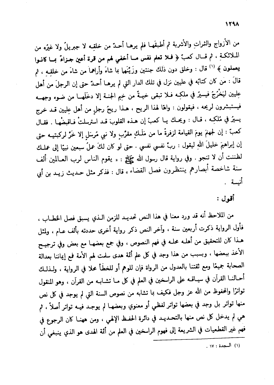 من الملاحظ أنه قد ورد معنا في هذا النص تحديد للزمن الذي يسبق فصل الخطاب، فأول الرواية ذكرت أربعين سنة، وآخر النص ذكر رواية أخرى حددته بألف عام، ولمثل هذا كان للتحقيق من أهله محله في فهم النصوص، وفي جمع بعضها مع بعض وفي ترجيح الأخذ ببعضها، وبسبب من هذا وجد في كل علم أئمة هدى سلمت لهم الأمة فمع إيماننا بعدالة الصحابة جميعًا ومع ثقتنا بالعدول من الرواة فإن للوهم أو للخطأ محلاً في الرواية، ولذلك أحالنا القرآن في سياقه على الراسخين في العلم في كل ما تشابه من القرآن، وهو المنقول تواترًا والمحفوظ من الله عز وجل فكيف بما تشابه من نصوص السنة التي لم يوجد في كل نص منها تواتر بل وجد في بعضها تواتر لفظي أو معنوي وبعضها لم يوجد فيه تواتر أصلًا، ثم هي لم يدخل كل نص منها بالتحديد في دائرة الحفظ الإلهي، ومن هنا كان الرجوع في فهم غير القطعيات في الشريعة إلى فهوم الراسخين في العلم من أئمة الهدى هو الذي ينبغي أن
