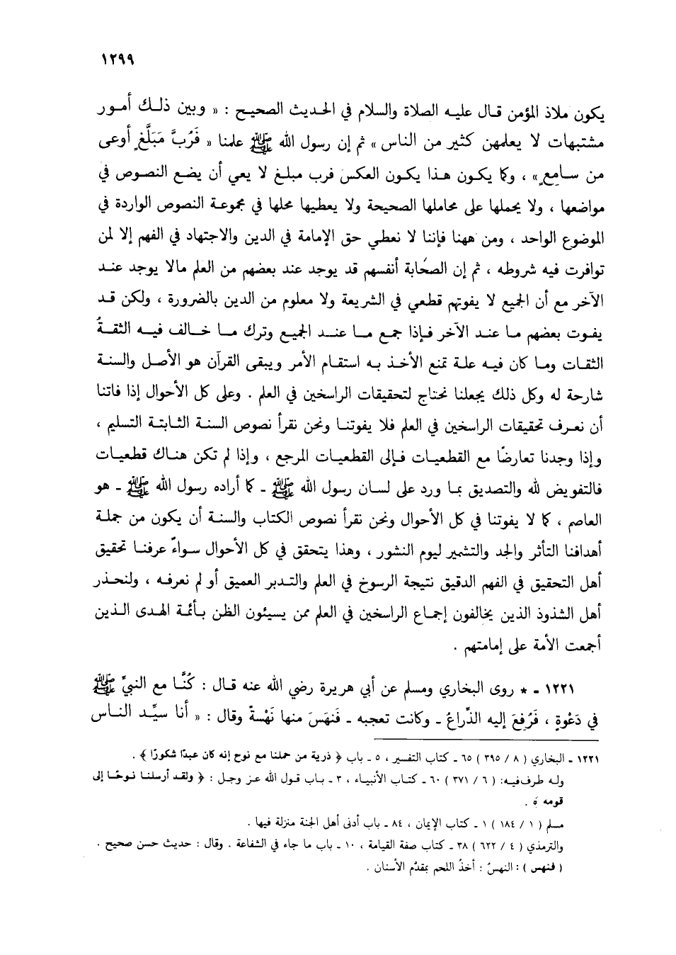 يكون ملاذ المؤمن قال عليه الصلاة والسلام في الحديث الصحيح: "وبين ذلك امور مشتبهات لا يعلمهن كثير من الناس" ثم إن رسول الله صلى الله عليه وسلم علمنا "فرب مبلغ أوعى من سامع"، وكما يكون هذا يكون العكس فرب مبلغ لا يعي أن يضع النصوص في مواضعها، ولا يحملها على محاملها الصحيحة ولا يعطيها محلها في مجموعة النصوص الواردة في الموضوع الواحد، ومن ههنا فإننا لا نعطي حق الإمامة في الدين والاجتهاد في الفهم إلا لمن توافرت فيه شروطه، ثم إن الصحابة أنفسهم قد يوجد عند بعضهم من العلم مالا يوجد عند الآخر مع أن الجميع لا يفوتهم قطعي في الشريعة ولا معلوم من الدين بالضرورة، ولكن قد يفوت بعضهم ما عند الآخر فإذا جمع ما عند الجميع وترك ما خالف فيه الثقة الثقات وما كان فيه عله تمنع الأخذ به استقام الأمر ويبقى القرآن هو الأصل والسنة شارحة له وكل ذلك يجعلنا نحتاج لتحقيقات الراسخين في العلم. وعلى كل الأحوال إذا فاتنا أن نعرف تحقيقات الراسخين في العلم فلا يفوتنا ونحن نقرأ نصوص السنة الثابتة التسليم، وإذا وجدنا تعارضا مع القطعيات المرجع، وإذا لم يكن هناك قطعيات فالتفويض لله والتصديق بما ورد على لسان رسول الله صلى الله عليه وسلم- كما أراده رسول الله صلى الله عليه وسلم- هو العاصم، كما لا يفوتنا في كل الأحوال ونحن نقرأ نصوص الكتاب والسنة أن يكون من جملة أهدافنا التأثر والجد والتشمير ليوم النشور، وهذا يتحقق في كل الأحوال سواء عرفنا تحقيق أهل التحقيق في الفهم الدقيق نتيجة الرسوخ في العلم والتدبر العميق أو لم نعرفه، ولنحذر أهل الشذوذ الذين يخالفون إجماع الراسخين في العلم ممن يسيئون الظن الهدى الذين أجمعت الأمة على إمامتهم.