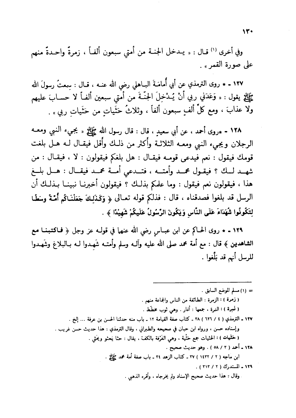 127 - * روى الترمذي عن أبي أمامة الباهلي رضي الله عنه، قال: سمعت رسول الله صلى الله عليه وسلم يقول: "وعدني ربي أن يدخل الجنة من أمتي سبعين ألفاً لا حساب عليهم ولا عذاب، ومع كل ألف سبعون ألفاً، وثلاث حثياتٍ من حثياتِ ربي".