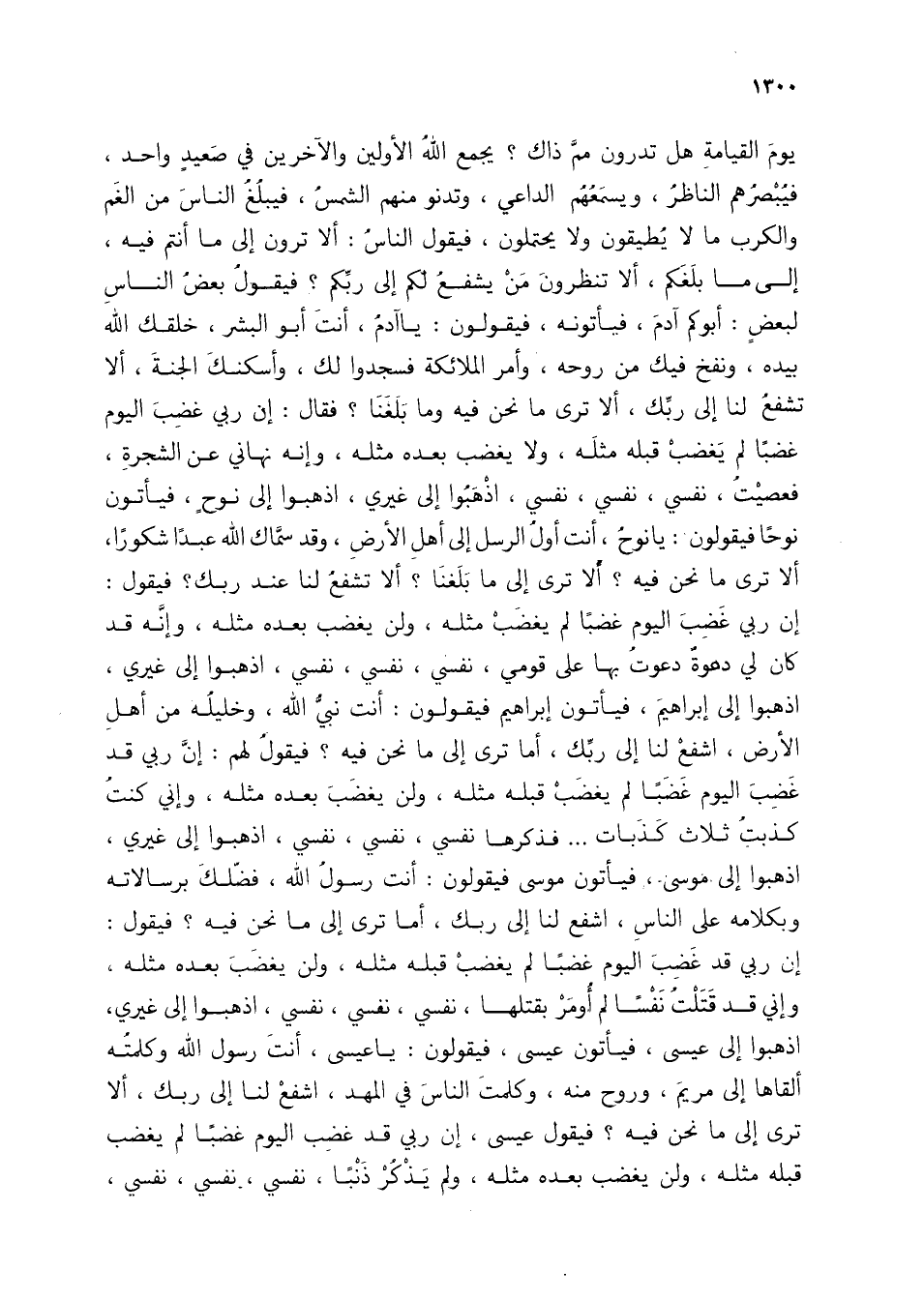 يوم القيامة هل تدرون مم ذاك؟ يجمع الله الأولين والأخرين في صعيد واحد، فيبصرهم الناظر، ويسمعهم الداعي، وتدنو منهم الشمس، فيبلغ الناس من الغم والكرب ما لا يطيقون ولا يحتملون، فيقول الناس: ألا ترون إلى ما أنتم فيه، إلى ما بلغكم، ألا تنظرون من يشفع لكم إلى ربكم؟ فيقول بعض الناس لبعض: أبوكم آدم، فيأتونه، فيقولون: يا آدم، أنت أبو البشر، خلقك الله بيده، ونفخ فيك من روحه، وأمر الملائكة فسجدوا لك، وأسكنك الجنة، ألا تشفع لنا إلى ربك، ألا ترى ما نحن فيه وما بلغنا؟ فقال: إن ربي غضب اليوم غضبا لم يغضب قبله مثله، ولا يغضب بعده مثله، وإنه نهاني عن الشجرة، فعصيت، نفسي، نفسي، نفسي، اذهبوا إلى غيري، اذهبوا إلى نوح، فيأتون نوحًا فيقولون: يا نوح، أنت أول الرسل إلى أهل الأرض، وقد سماك الله عبدًا وشكورًا، ألا ترى ما نحن فيه؟ ألا تشفع لنا عند ربك؟ فيقول: إن ربي غضب اليوم غضبًا لم يغضب مثله، ولن يغضب بعد مثله، وإنه قد كان لي دعوة دعوت بها على قومي، نفسي، نفسي، نفسي، اذهبوا إلى غيري، اذهبوا إلى إبراهيم، فيأتون إبراهيم فيقولون: أنت بني الله، وخليله من أهل الأرض، اشفع لنا إلى ربك، إما ترى إلى ما نحن فيه؟ فيقول لهم: إن ربي قد غضب اليوم غضبًا لم يغضب قبله مثله، ولن يغضب بعد مثله، وإني كنت كذبت ثلاث كذبات ... فذكرها نفسي، نفسي، نفسي، اذهبوا إلى غيري، اذهبوا إلى موسى، فيأتون موسى فيقولون: أنت رسول الله، فضلك برسالاته وبكلامه على الناس، اشفع لنا إلى ربك، أما ترى إلى ما نحن فيه؟ فيقول إن ربي قد غضب اليوم غضبًا لم يغصب قبله مثله، ولن يغضب بعده مثله، وإني قد قتلت نفسًا لم أومر بقتلها، نفسي، نفسي، نفسي، اذهبوا إلى غيري، اذهبوا إلى عيسى، فيقولون: يا عيسى، أنت رسول الله وكلمته ألقاها إلى مريم، وروح منه، وكلمت الناس في المهد، اشفع لنا إلى ربك، ألا ترى إلى ما نحن فيه؟ فيقول عيسى، إن ربي قد غضب اليوم غضبًا لم يغضب قبله مثله، ولن يغضب بعده مثله، ولم يذكر ذنبًا، نفسي، نفسي، نفسي،