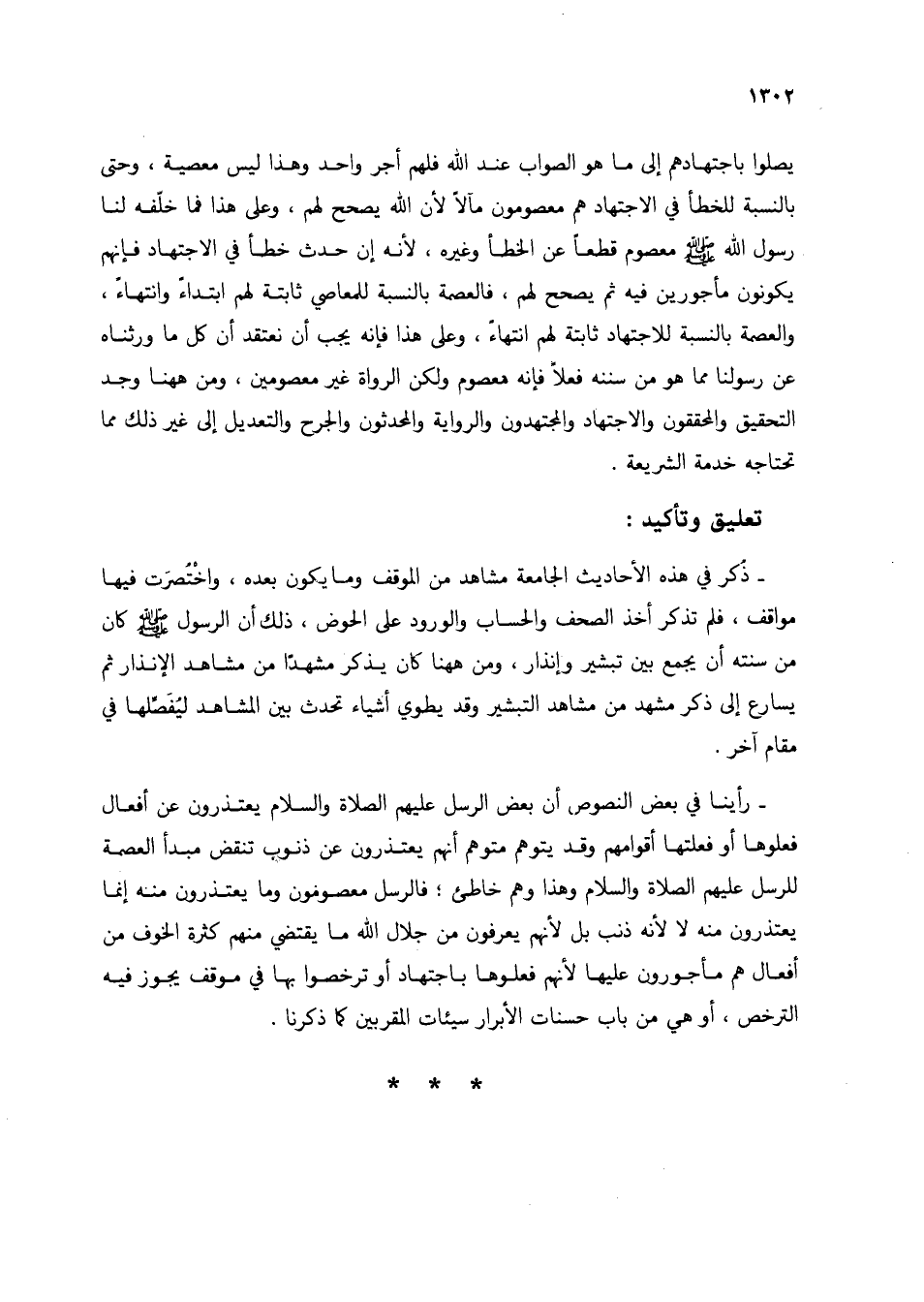 يصلوا باجتهادهم إلى ما هو الصواب عند الله فلهم أجر واحد وهذا ليس معصية، وحتى بالنسبة للخطأ في الاجتهاد هم معصومون مآلا لأن الله يصحح لهم، وعلى هذا فما خلقه لنا رسول الله صلى الله عليه وسلم معصوم قطعًا عن الخطأ وغيره، لأنه إن حدث خطأ في الاجتهاد فإنهم يكونون مأجورين فيه ثم يصحح لهم، فالعصمة بالنسبة للمعاصي ثابتة لهم ابتداء وانتهاء، والعصمة بالنسبة للاجتهاد ثابتة لهم انتهاء، وعلى هذا فإنه يجب أن كل ما ورثناه عن رسولنا مما هو من سننه فعلا فإنه معصوم ولكن الرواة غير معصومين، ومن ههنا وجد التحقيق والمحققون والاجتهاد والمجتهدون والرواية والمحدثون والجرح والتعديل إلى غير ذلك مما تحتاجه خدمة الشرعية.