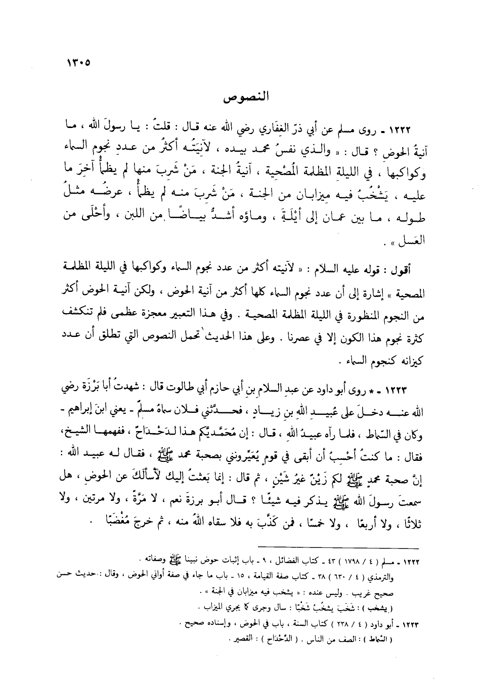 1222 - * روى مسلم عن أبي ذر الغفاري رضي الله عنه قال: قلت: يا رسول الله، ما آنية الحوض؟ قال: "والذي نفس محمد بيده، لآنيته أكثر من عدد نجوم السماء وكواكبها، في الليلة المظلمة المصحية، آنية الجنة، من شرب منها لم يظمأ آخر ما عليه، يشخب فيه ميزابان من الجنة، من شرب منه لم يظمأ، عرضه مثل طوله، ما بين عمان إلى أيلة، وماؤه أشد بياضًا من اللبن، وأحلى من العسل".