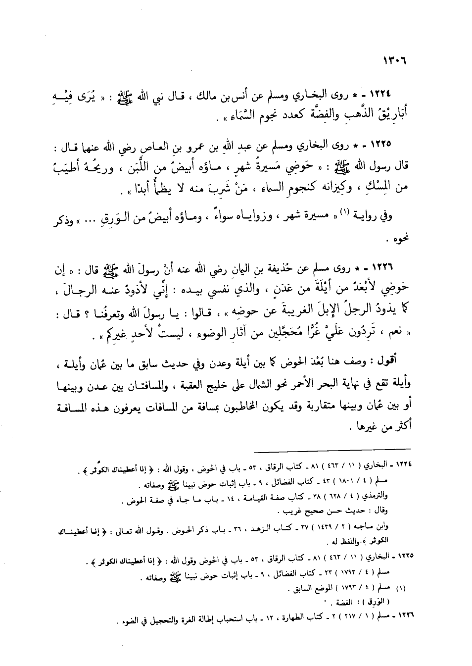1226 - * روى مسام عن حذيفة بن اليمان رضي الله عنه أن رسول الله صلى الله عليه وسلم قال: "إن حوضي لأبعد من أيلة من عدن، والذي نفسي بيده: إني لأذود عنه الرجال، كما يذود الرجال الإبل الغريبة عن حوضه"، قالوا: يا رسول الله وتعرفنا؟ قال: "نعم، يردون على غرا محجلين من آثار الوضوء، ليست لأحد غيركم".