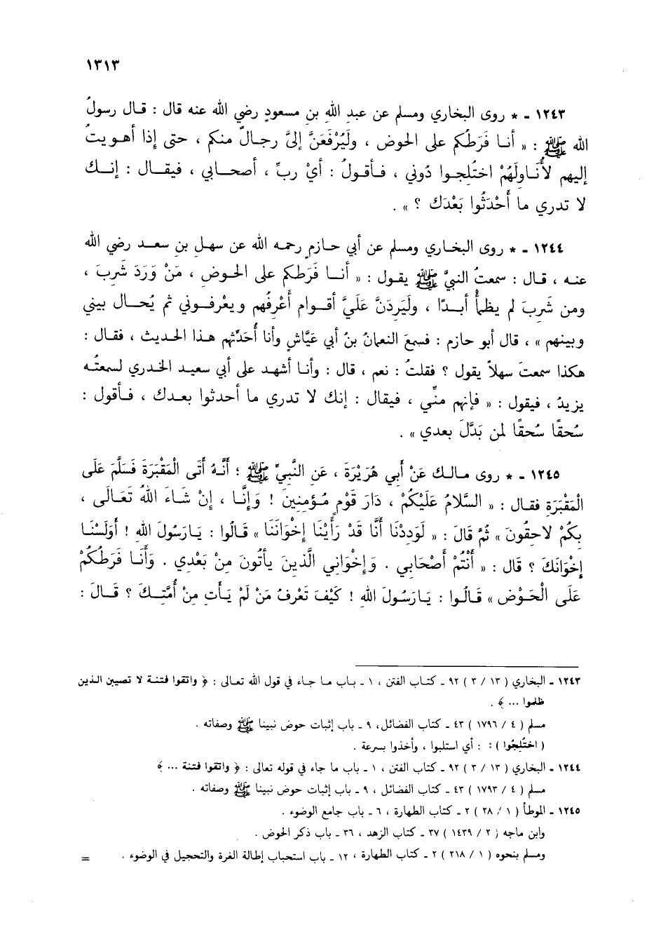 1243 - * روى البخاري ومسلم عن عبد الله بن مسعود رضي الله عنه قال: قال رسول الله صلى الله عليه وسلم: "أنا فرطكم على الحوض، وليرفعن إلى رجال منكم، حتى إذا أهويت إليهم لأناولهم اختلجوا دوني، فأقول: أي رب، أصحابي، فيقال: إنك لا تدري ما أحدثوا بعدك؟ ".