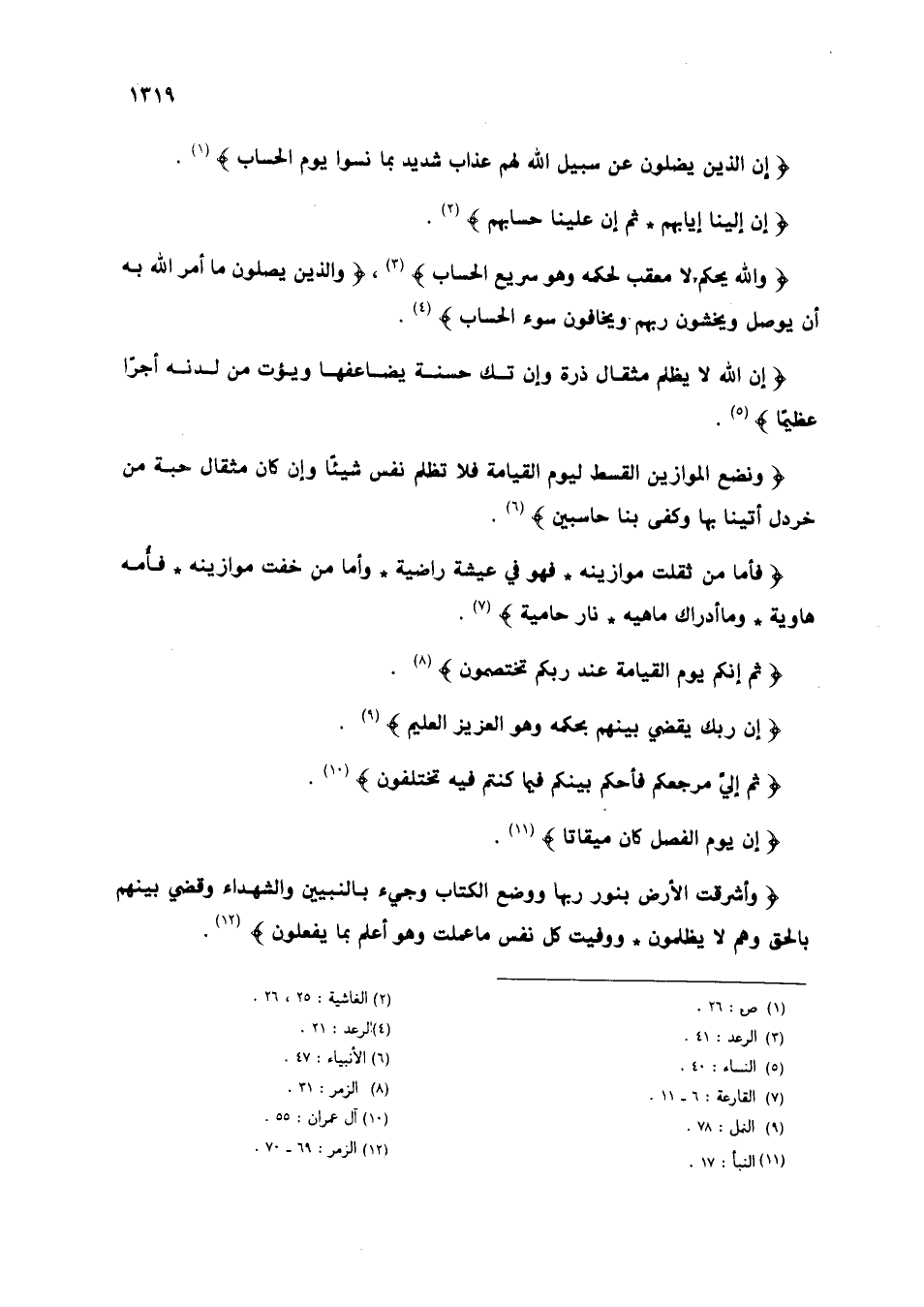 {وَأَشْرَقَتِ الْأَرْضُ بِنُورِ رَبِّهَا وَوُضِعَ الْكِتَابُ وَجِيءَ بِالنَّبِيِّينَ وَالشُّهَدَاءِ وَقُضِيَ بَيْنَهُمْ بِالْحَقِّ وَهُمْ لَا يُظْلَمُونَ * وَوُفِّيَتْ كُلُّ نَفْسٍ مَا عَمِلَتْ وَهُوَ أَعْلَمُ بِمَا يَفْعَلُونَ} (12).