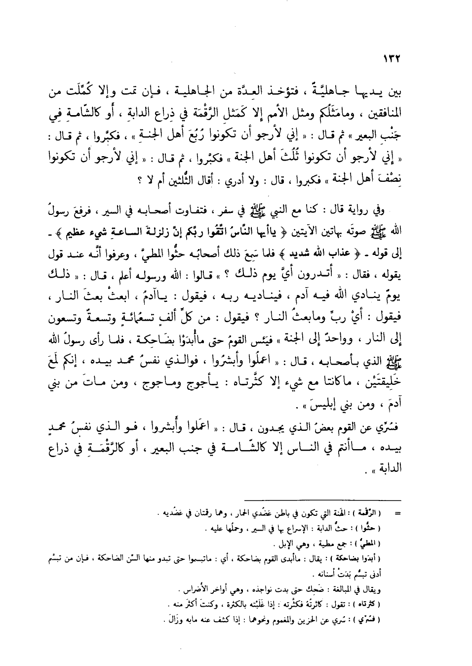 بين يديها جاهلية، فتؤخذ العدة من الجاهلية، فإن تمت وإلا كملت من المنافقين، وما مثلكم ومثل الأمم إلا كمثل الرقمة في ذراع الدابة، أو كالشامة في جنب البعير" ثم قال: "إني لأرجو أن تكونوا ربع أهل الجنة"، فكبروا، ثم قال: "إني لأرجو أن تكونوا ثلث أهل الجنة" فكبروا، ثم قال: "إني لأرجو أن تكونوا نصف أهل الجنة" فكبروا، قال: ولا أدري: أقال الثلثين أم لا؟