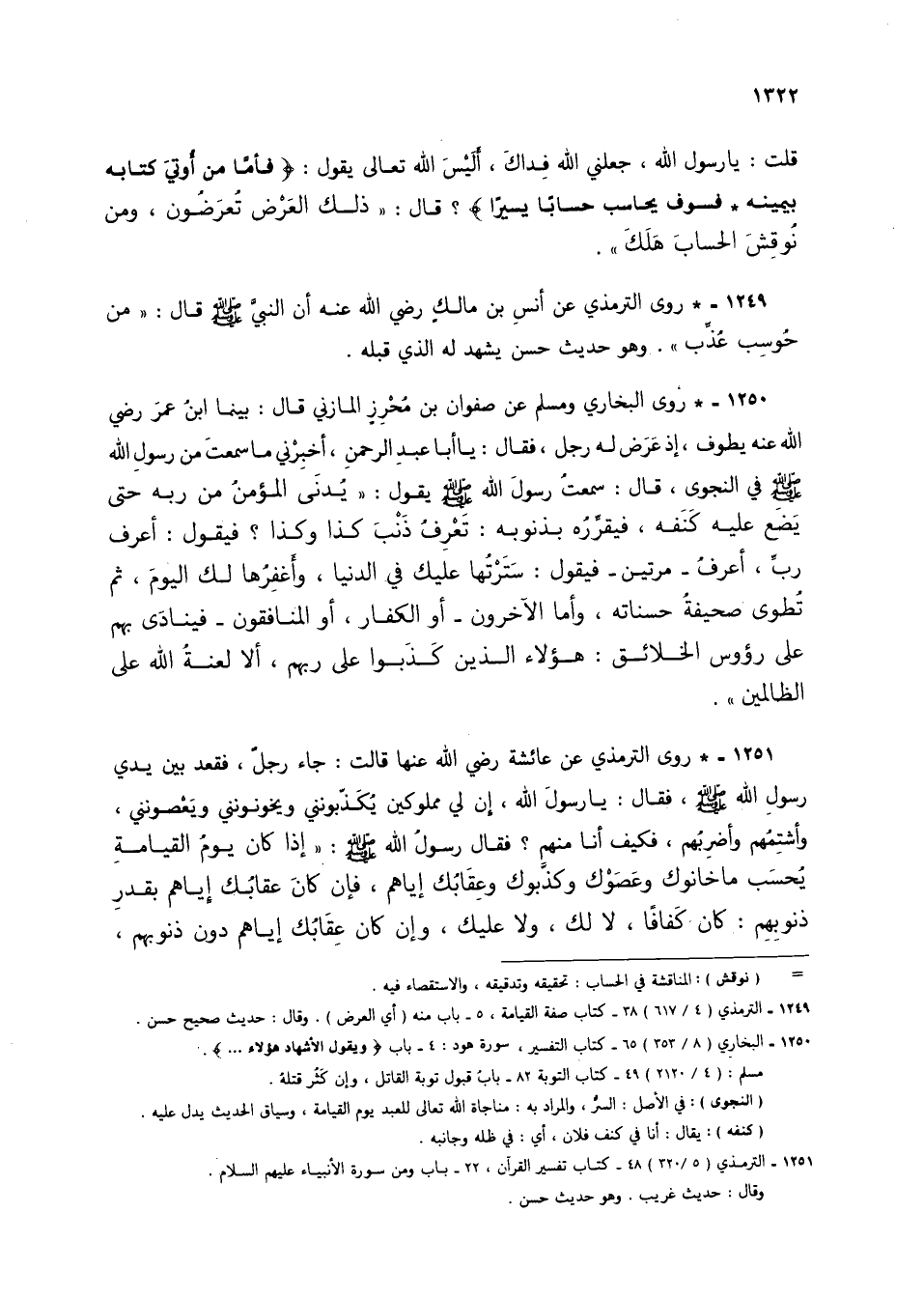 1249 - * روى الترمذي عن أنس بن مالك رضي الله عنه أن النبي صلى الله عليه وسلم قال: "من حوسب عذب". وهو حديث حسن يشهد له الذي قبله.