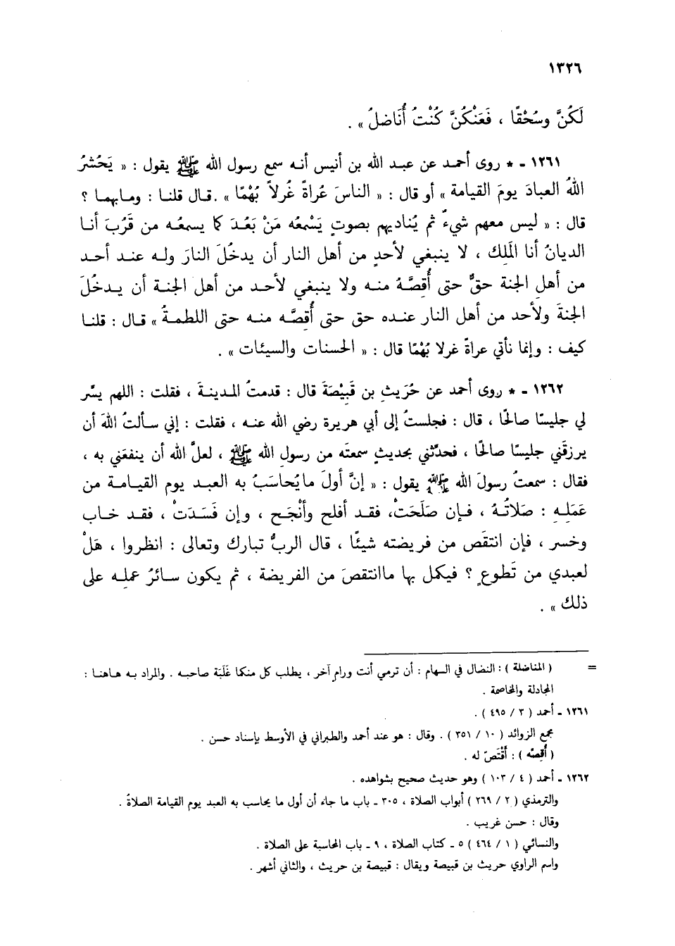 1261 - * روى أحمد عن عبد الله بن أنيس أنه سمع رسول الله صلى الله عليه وسلم يقول: "يحشر الله العباد يوم القيامة" أو قال: "الناس عراة غرلا بهما" قال قلنا: وما بهما؟ قال: "ليس معهم شيء ثم يناديهم بصوت يسمعه من بعد كما يسمعه من قرب أنا الديان أنا الملك، لا ينبغي لأحد من أهل النار أن يدخل النار وله عند أحد من أهل الجنة حق حتى أقصه منه ولا ينبغي لأحد من أهل الجنة أن يدخل الجنة ولأحد من أهل النار عنده حق حتى أقصه منه حتى اللطمة" قال: قلنا كيف: وإنما نأتي عراة بهما قال: "الحسنات والسيئات".