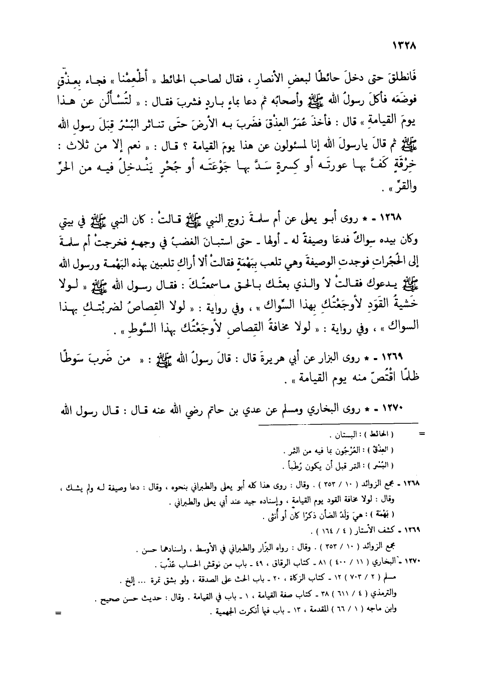 1268 - * روى أبو يعلي عن أم سلمة زوج النبي صلى الله عليه وسلم قال: كان النبي صلى الله عليه وسلم في بيتي وكان بيده سواك فدعا وصيفة له -أولها- حتى استبان الغضب في وجهه فخرجت أم سلمة إلى الحجرات فوجدت الوصيفة وهي تلعب ببهمة فقالت ألا أراك تعلبين بهذه البهمة ورسول الله صلى الله عليه وسلم يدعوك فقالت لا والذي بعثك بالحق ما سمعتك: فقال رسول الله صلى الله عليه وسلم "لولا خشية القود لأوجعتك بهذا السواك"، وفي رواية: "لولا القصاص لضربتك بهذا السواك"، وفي رواية: "لولا مخافة القصاص لأوجعتك بهذا السواك".