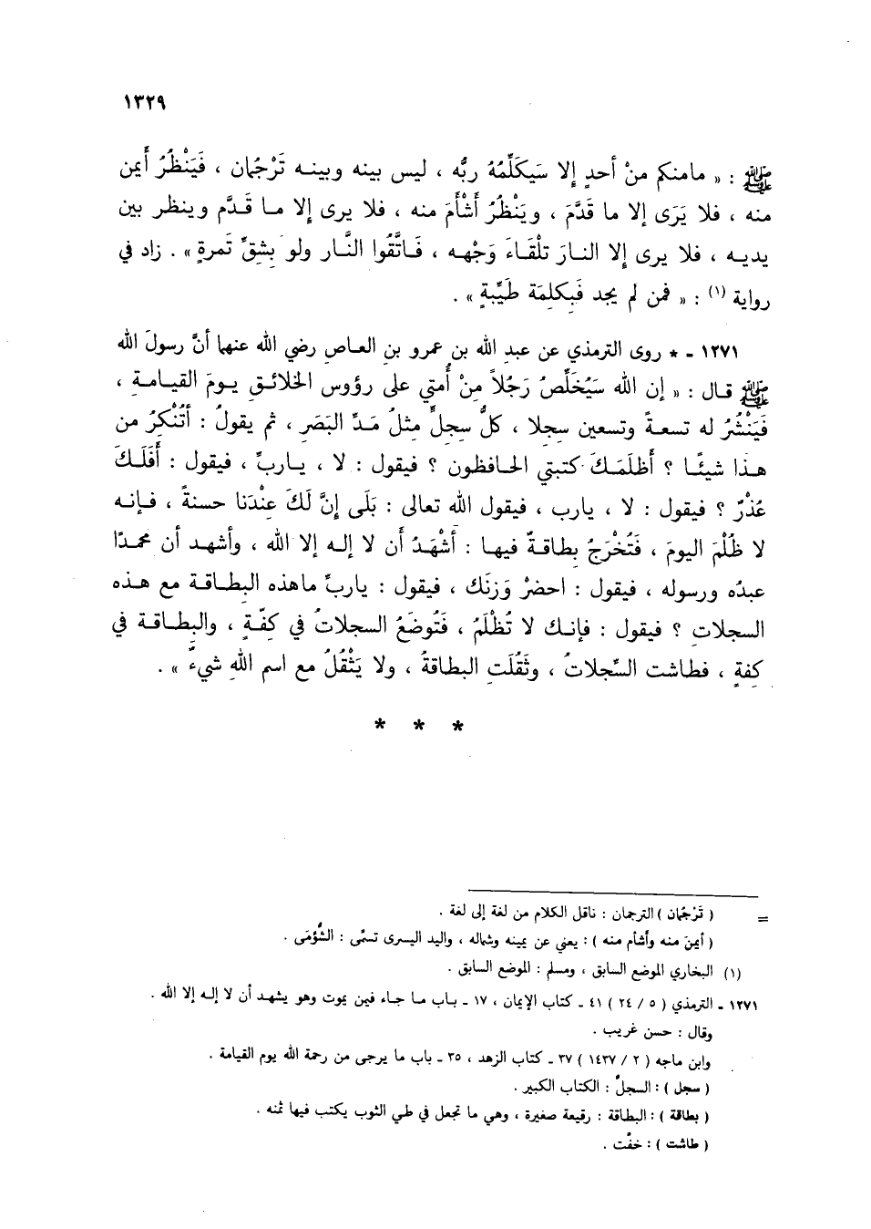 1271 - * روى الترمذي عن عبد الله بن عمرو بن العاص رضي الله عنهما أن رسول الله صلى الله عليه وسلم قال: "إن الله سيخلص رجلا من أمتي على رؤوس الخلائق يوم القيامة، فينشر له تسعو وتسعين سجلا، كل سجل مثل مد البصر، ثم يقول: أتنكر من هذا شيئًا؟ أظلمك كتبتي الحافظون؟ فيقول: لا، يا رب، فيقول: أفلك عذر؟ فيقول: لا، يا رب، فيقول الله تعالى: بلى إن لك عندنا حسنة، فإنه لا ظلم اليوم، فتخرج بطاقة فيها: أشهد أن لا إله إلا الله، وأشهد أن محمدًا عبده ورسوله، فيقول: احضر وزنك، فيقول: يا رب ما هذه البطاقة مع هذه السجلات؟ فيقول: فإنك لا تظلم، فتوضع السجلات في كفة، والبطاقة في كفة، فطاشت السجلات، وثقلت البطاقة، ولا يثقل مع اسم الله شيء".