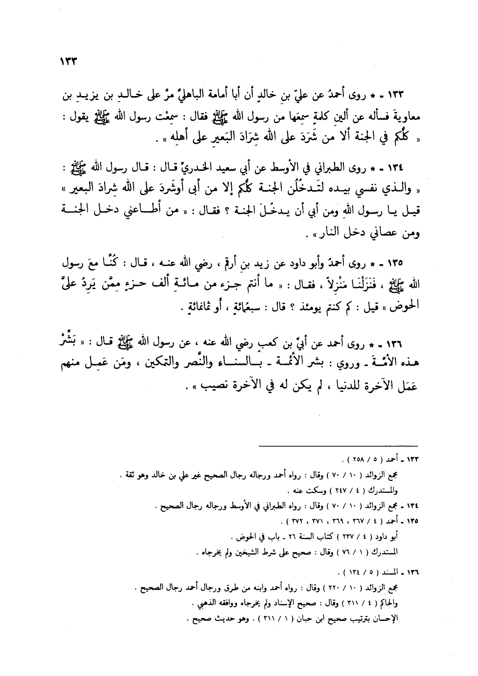 133 - * روى أحمد عن علي بن خالد أن أبا إمامة الباهلي مر على خالد بن يزيد بن معاوية فسأله عن ألين كلمة سمعها من رسول الله صلى الله عليه وسلم فقال: سمعت رسول الله صلى الله عليه وسلم يقول: "كلكم في الجنة ألا من شرد على الله شراد البعير على أهله".